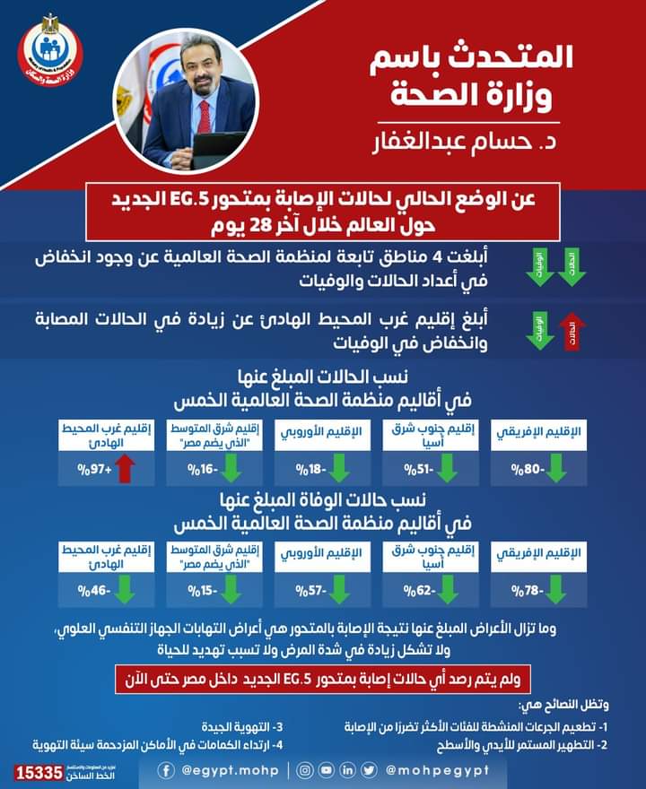 وأكد أنه لم يتم رصد أي حالات إصابة بمتحور 5. EG الجديد داخل مصر حتى الآن.