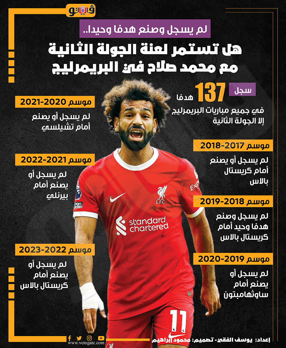لم يسجل وصنع هدفا وحيدا.. هل تستمر لعنة الجولة الثانية مع محمد صلاح في البريمرليج (انفوجراف) السبت 19/أغسطس/2023 - 01:00 م 8/19/2023 1:00:12 PM محمد صلاح، فيتو يوسف الفقي شارك طباعة 18 حجم الخط شارك طباعة ليفربول محمد صلاح نادي ليفربول ليفربول وبورنموث مباراة ليفربول وبورنموث