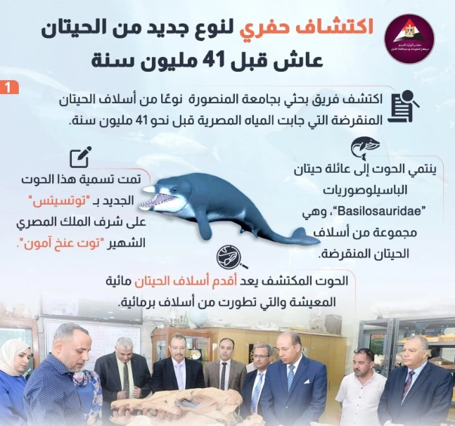 نشر مركز معلومات مجلس الوزراء، أن وسائل إعلام عالمية سلطت الضوء على اكتشاف جامعة المنصورة الخاص بحوت عاش قبل 41 مليون سنة من النوع المنقرض "توت سيتوس".