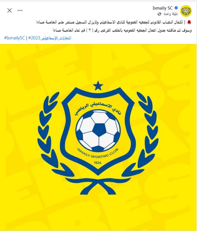 أعلن النادي الإسماعيلي عبر حسابه الرسمي اكتمال النصاب القانوني للجمعية العمومية للدراويش لاختيار مجلس إدارة جديد يدير القلعة الصفراء.