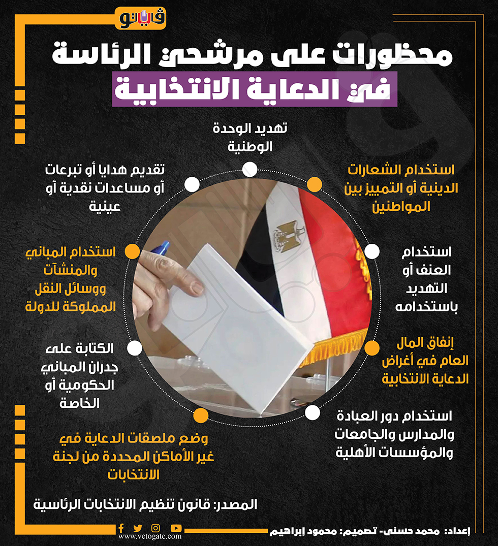 محظورات على مرشحي الرئاسة في الدعاية الانتخابية (انفوجراف) السبت 19/أغسطس/2023 - 06:06 م 8/19/2023 6:06:42 PM التصويت في الانتخابات الرئاسية محمد حسنى شارك طباعة 18 حجم الخط شارك طباعة