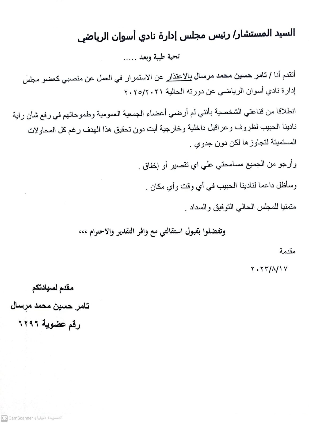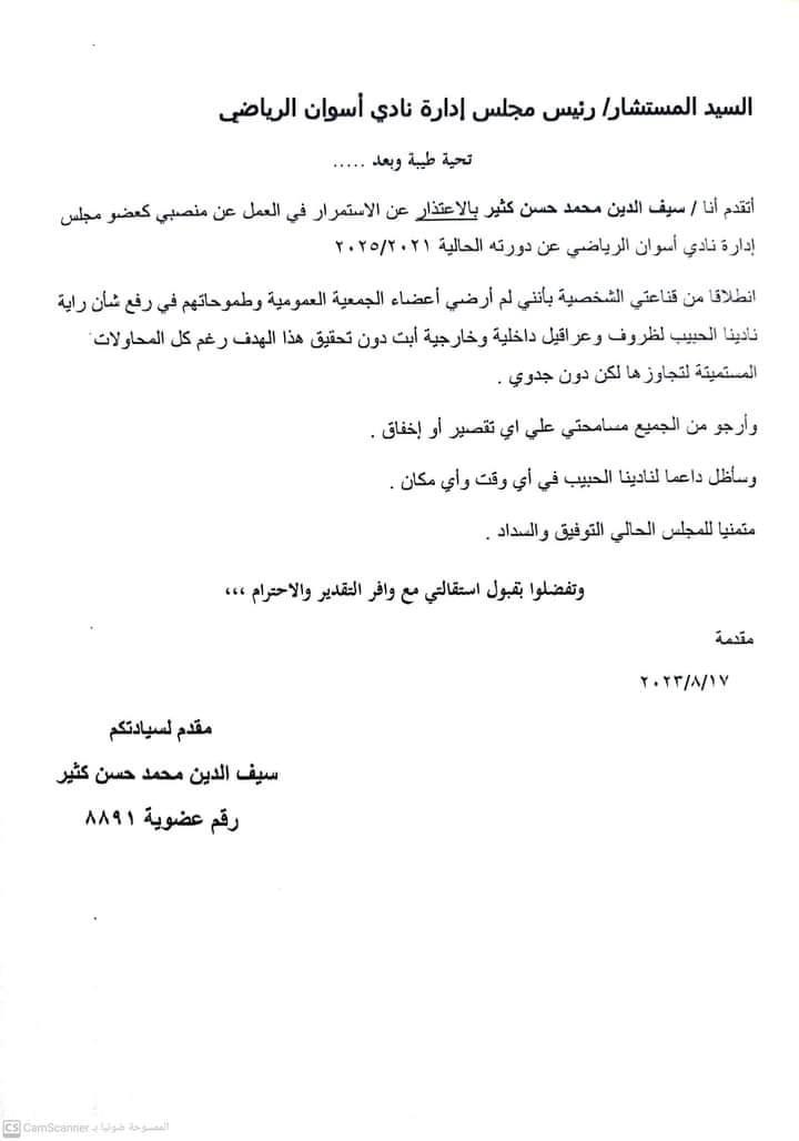 وتقدم عضوا مجلس إدارة نادى أسوان الرياضي سيف الدين محمد حسن كثير وتامر حسين محمد مرسال بخطاب رسمي إلى رئيس مجلس إدارة النادي ينص على اعتذارهم عن منصبهم كأعضاء مجلس إدارة.