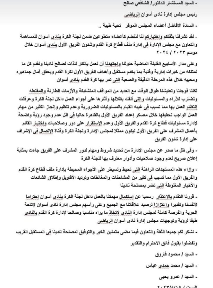 تقدم أعضاء بمجلس إدارة نادي أسوان الرياضي باستقالتهم من المجلس، بعد اعتذار أعضاء لجنة الكرة عن عدم استكمال مهمتهم في إدارة ملف كرة القدم وشئون الفريق الأول خلال الموسم ٢٠٢٣/٢٠٢٤.