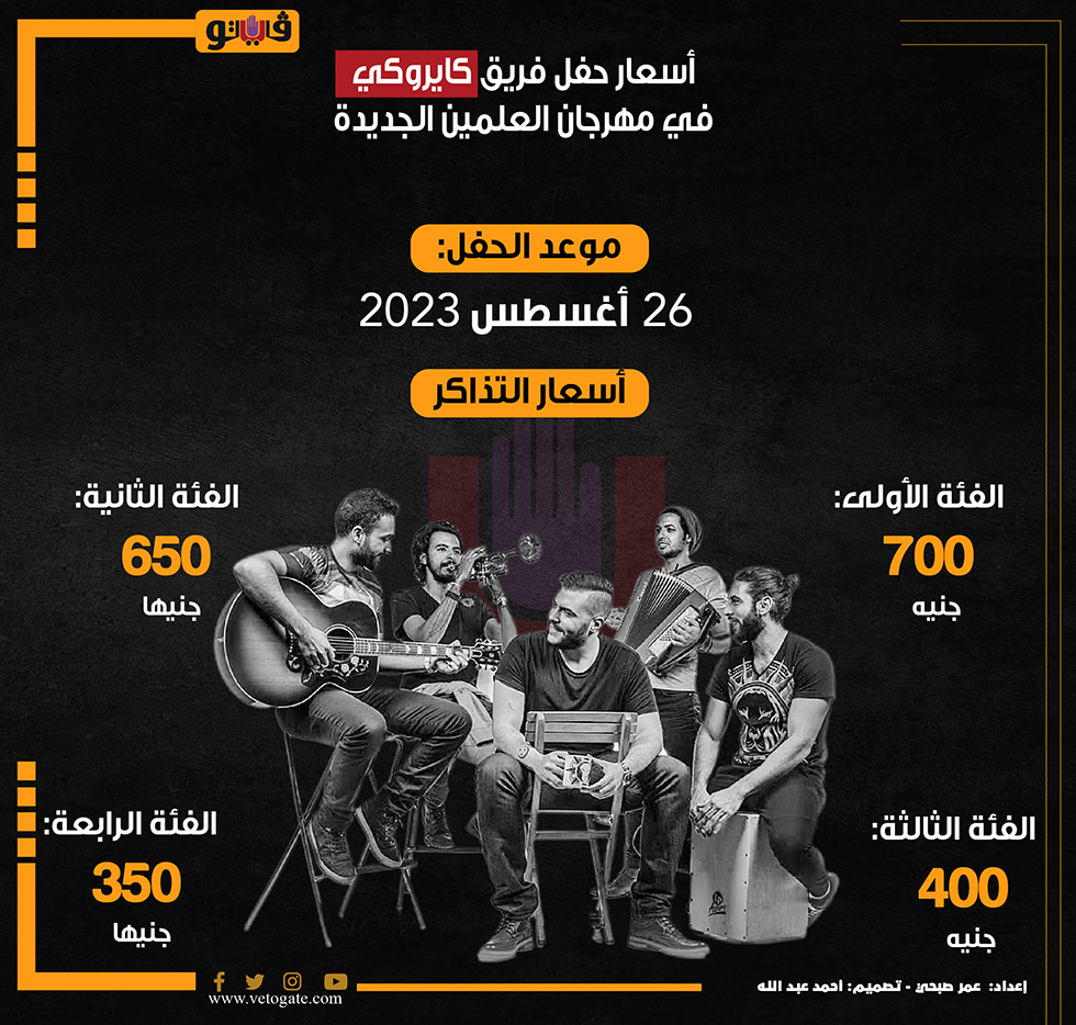أسعار حفل فريق كايروكي في مهرجان العلمين الجديدة (إنفوجراف) الأحد 20/أغسطس/2023 - 11:17 ص 8/20/2023 11:17:33 AM كايروكي، فيتو عمر صبحي شارك طباعة 18 حجم الخط شارك طباعة كايروكي أغاني فريق كايروكي حفل فريق كايروكي