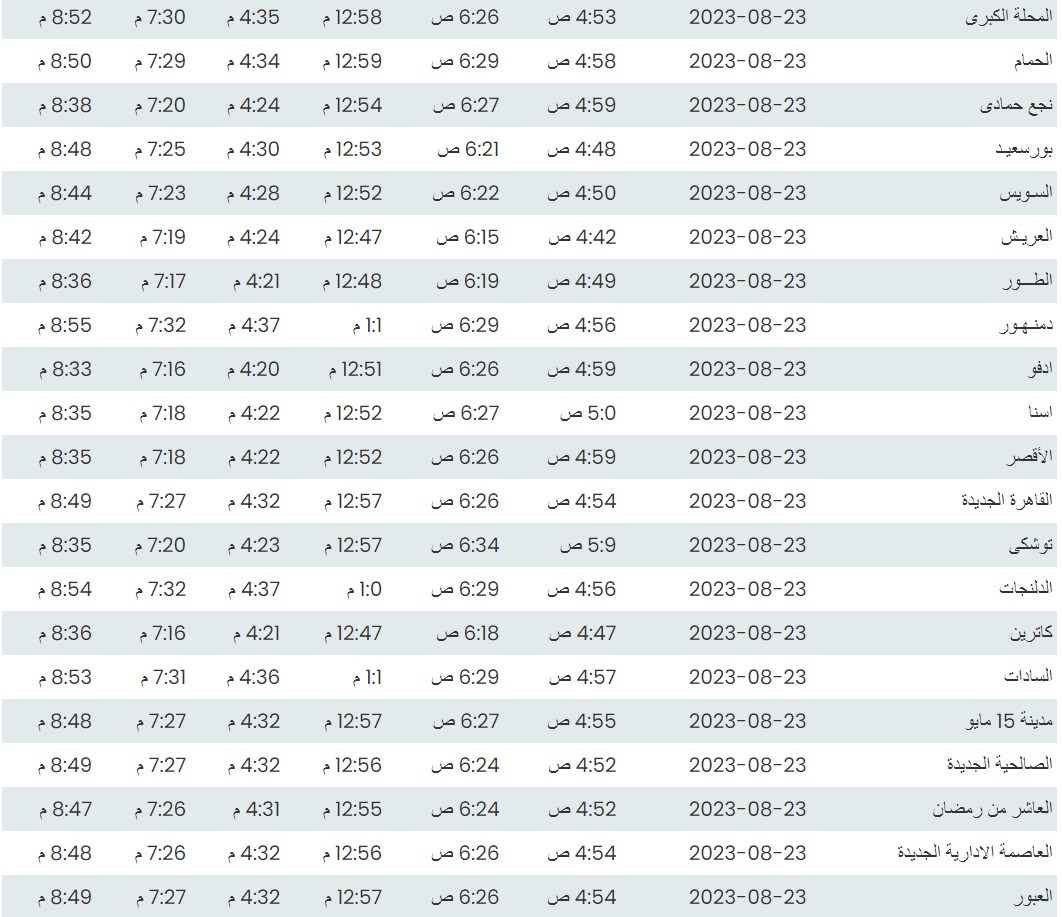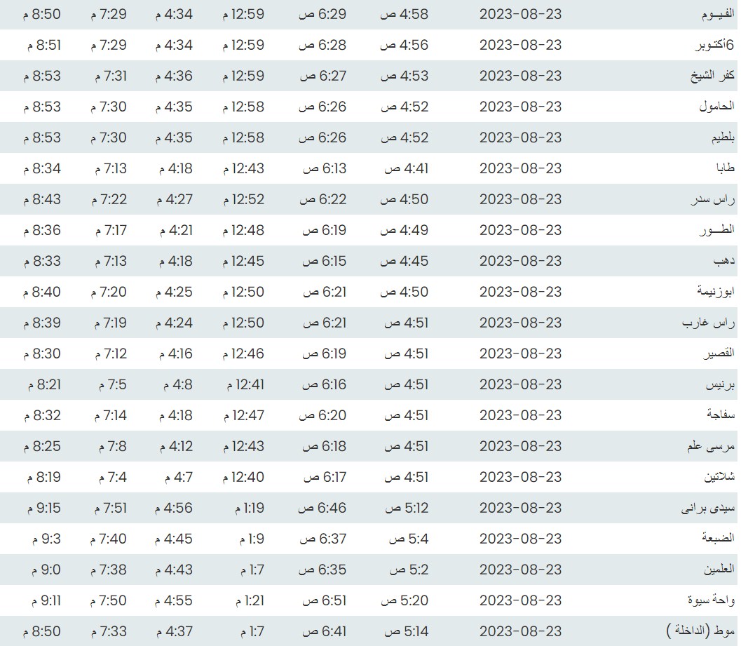 مواقيت الصلاة اليوم وفقًا للتوقيت المحلي لمدينتي القاهرة والإسكندرية وعدد من مدن ومحافظات الجمهورية من واقع بيانات الهيئة العامة للمساحة