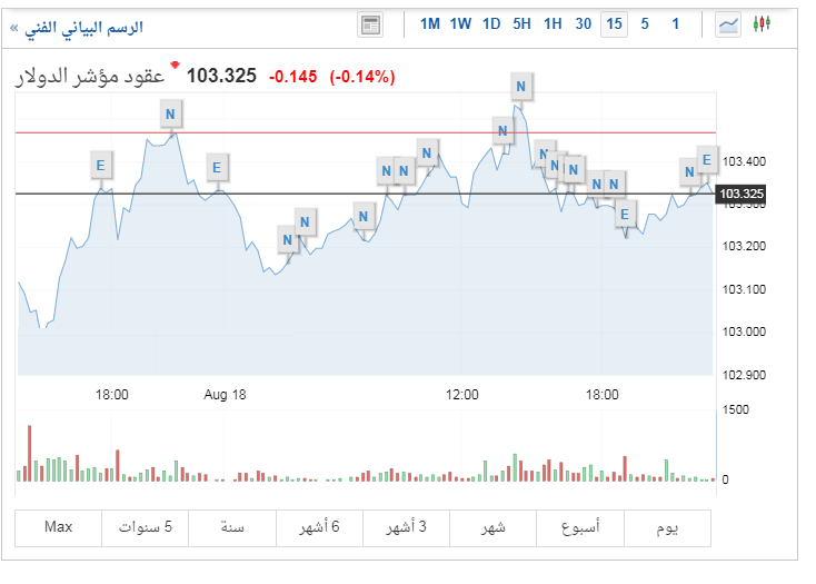 استقر مؤشر الدولار بنسبة طفيفة ليستقر عند المستوى 103.325 نقطة، مؤشر الدولار هو نسبة العملة الأمريكية مقابل عملات الدول الأخرى مثل الدولار بـ العملات الستة التالية : اليورو، الين الياباني، الفرنك السويسري، الدولار الكندي، الكرونا السويدية، والجنيه الإسترليني، كما أن العملات لديها حصص مختلفة نسبيا عند المقارنة بينهم البعض، من هذا المنطلق يتم حساب مؤشر الدولار كمتوسط المرجح من أسعار العملات الستة والحصة الأكبر لليورو 50%.