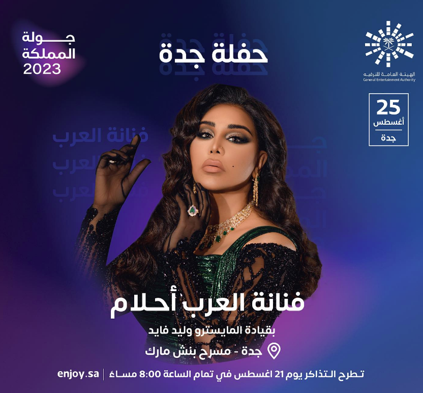 تحيي المطربة الإماراتية أحلام حفلا غنائيا مميزا وذلك مساء يوم الجمعة المقبل الموافق 25 أغسطس الجاري، على مسرح بنش مارك بمدينة جدة بالمملكة العربية السعودية.