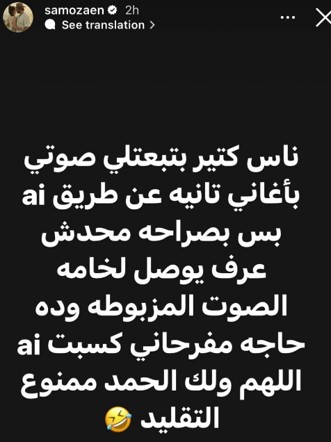 وكتب ساموزين ستوري عبر خاصية الاستوري قائلا: "فيه ناس كتير بتبعتلي صوتي وأنا بغني أغاني تانية عن طريق الذكاء الاصطناعي بس بصراحه محدش عرف يوصل لخامة الصوت المظبوطة وده حاجة مفرحاني".