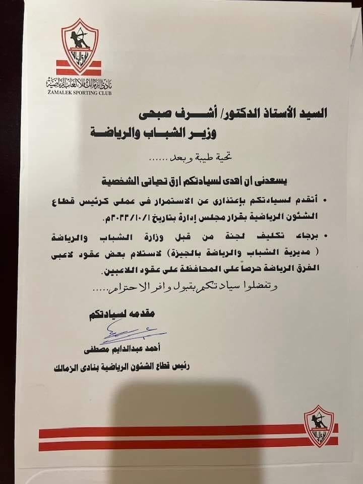 الزمالك، أرسل أحمد عبد الدايم مصطفى رئيس قطاع الشئون الرياضية بنادي الزمالك خطابا رسميا لوزارة الشباب والرياضة يعتذر فيه عن استمراره بالعمل في منصبه.