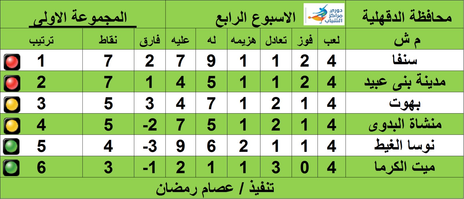 تصدر جدول ترتيب دورى مراكز الشباب في "الأسبوع الرابع من دورى مراكز الشباب" فريق مركز شباب سنفا بميت غمر، برصيد 7 نقاط والمركز الأول ضمن المجموعة الأولى، وتراجع مركز شباب مدينة بني عبيد، الذي كان متصدرًا في الأسبوع الثالث إلى المركز الثاني برصيد 7 نقاط بفارق الأهداف.