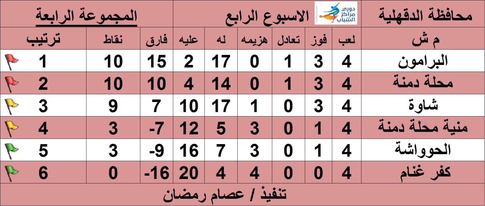 أما المجموعة الرابعة والأخيرة ما زال يتصدر ترتيب الدوري بها مركز شباب البرامون برصيد 10 نقاط، واحتل المركز الأول بهذه المجموعة، يليه مركز شباب محلة الدمنة في المركز الثانى، برصيد 10 نقاط بفارق الأهداف، في إطار مباريات دورى مراكز الشباب بالدقهلية النسخة العاشرة 2023.