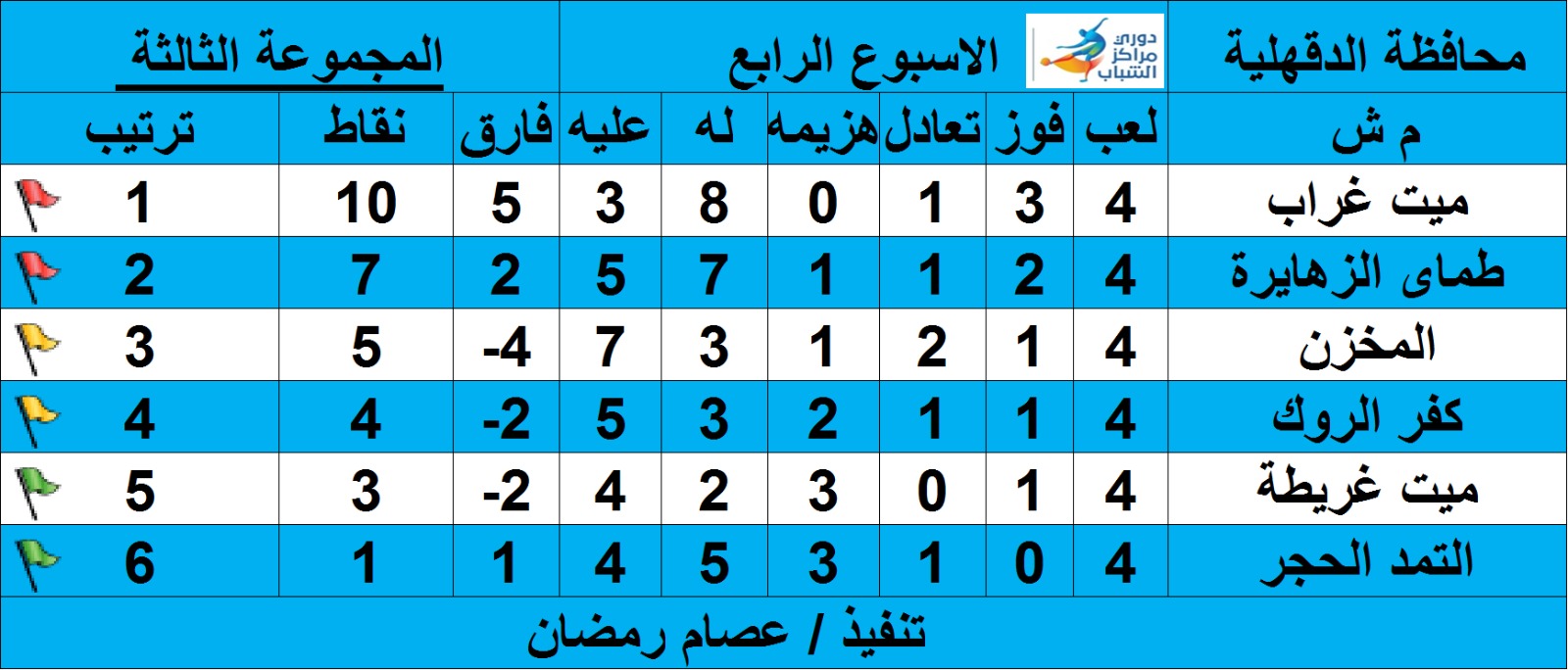 المجموعة الثالثة ما زال متصدرًا ترتيب الدوري بها مركز شباب ميت غراب بإدارة شباب السنبلاوين برصيد 10 نقاط والمركز الأول، بالإضافة إلى بقاء مركز شباب طماي الزهايرة فى المركز الثاني برصيد 7 نقاط، بالمجموعة الثالثة.