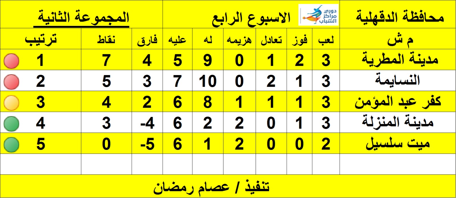 أما المجموعة الثانية فقد تصدر ترتيب الدورى مركز شباب مدينة المطرية برصيد 7 نقاط، والمركز الأول ضمن المجموعة الثانية، وتراجع فريق مركز شباب النسايمة بالمنزلة إلى المركز الثاني برصيد 5 نقاط الذي كان متصدرًا الأسبوع الثالث بالدوري.