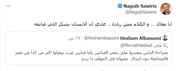 جاء ذلك ردًا على أحد متابعيه، الذي عبر عن رأيه فيما فعله الفنان محمد الحلو، فقال: "بصراحة الناس بتقسوا على بعض الفنانين ياما فنانين عرب بيقولوا اكتر من كدا عن مصر فالمجاملة دون ابتذال مقبولة في الموقف دا بردو".