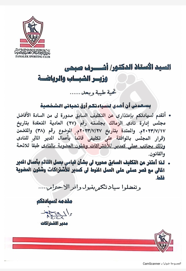 الزمالك، تنشر فيتو استقالة إيهاب خضر القائم بأعمال المدير المالي لنادي الزمالك التي تقدم بها لوزارة الشباب والرياضة والاكتفاء بمنصبه كمدير للاشتراكات في نادي الزمالك.