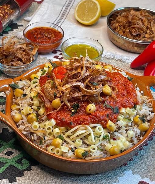 نضع الارز بالشعرية، ثم المكرونة، ثم العدس بجبة، ثم الصلصة، ثم الحمص، ثم في النهاية التقلية.