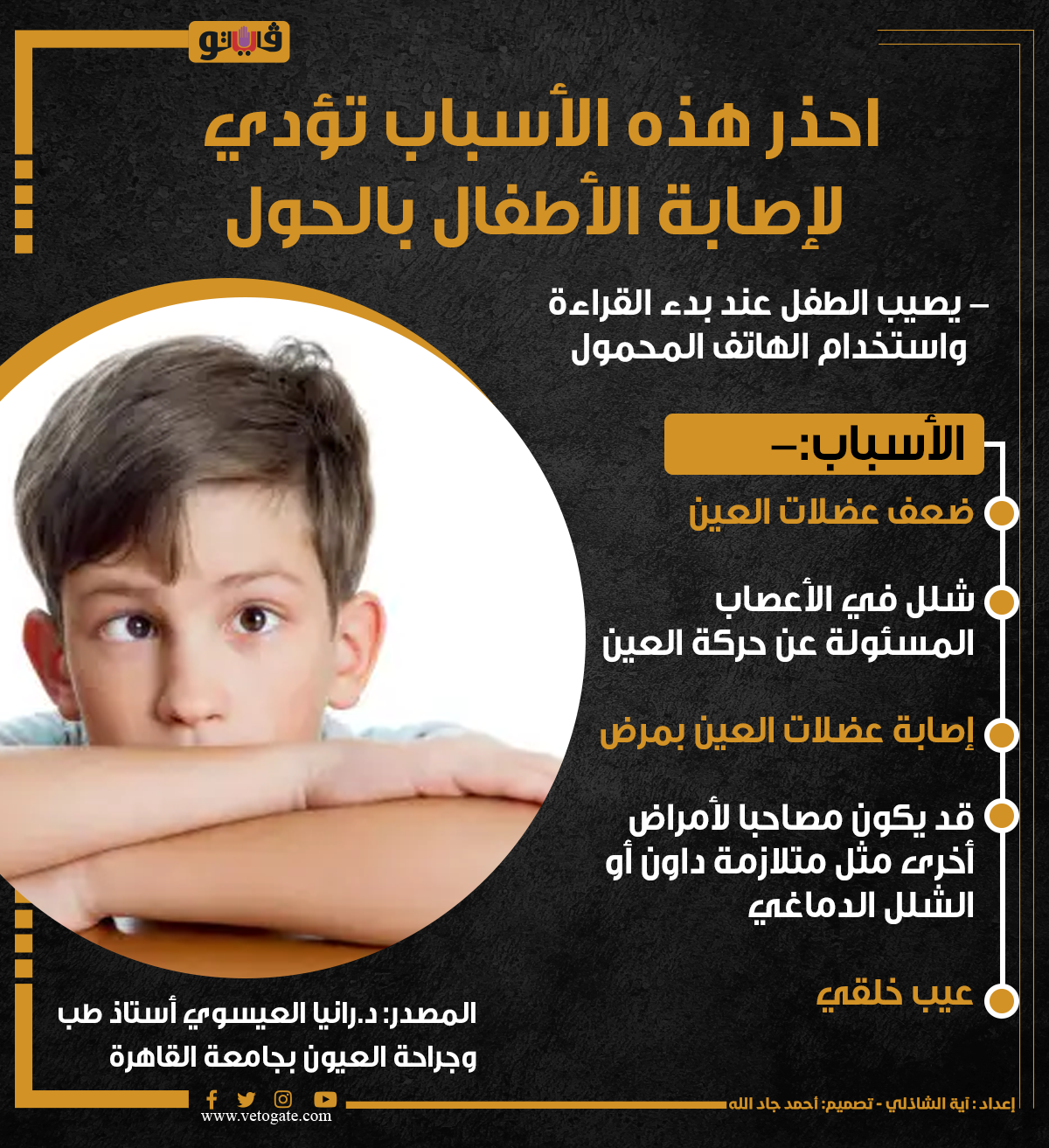 احذر هذه الأسباب تؤدي لإصابة الأطفال بالحول (إنفوجراف) الثلاثاء 22/أغسطس/2023 - 12:07 م 8/22/2023 12:07:50 PM الحول في الأطفال، فيتو آية الشاذلي شارك طباعة 18 حجم الخط شارك طباعة الشلل الدماغي استخدام الهاتف المحمول الحول النظارة الطبية ضعف النظر عيب خلقى الحول المفاجئ الحول عند الأطفال علاج الحول عند الأطفال
