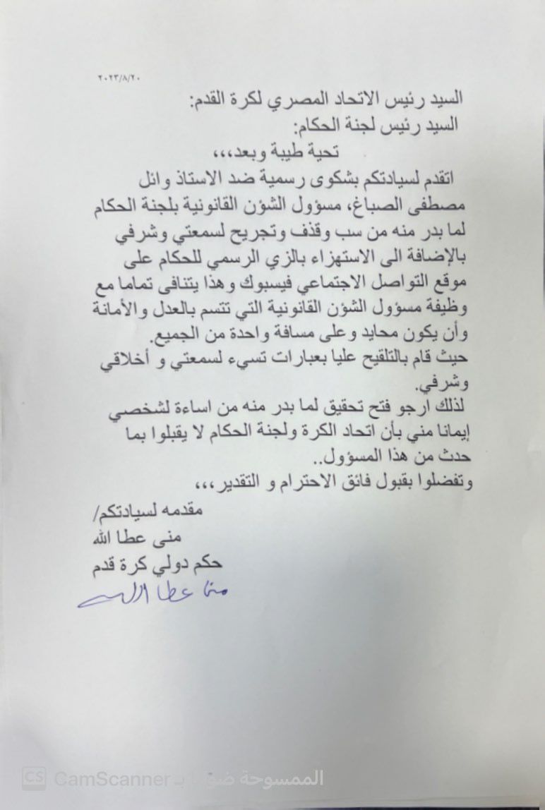 نحن مجموعة من حكام ومحكمات كرة القدم المصرية نرفض التجاوزات والإساءات الأخلاقية التي حدثت من مسئول الشئون القانونية "وائل مصطفى الصباغ" ضد رمز التحكيم المصري الكابتن منى عطا الله صاحبة التاريخ المشرف لمصر على مدار 19 عاما ضمن القائمة الدولية للحكام.