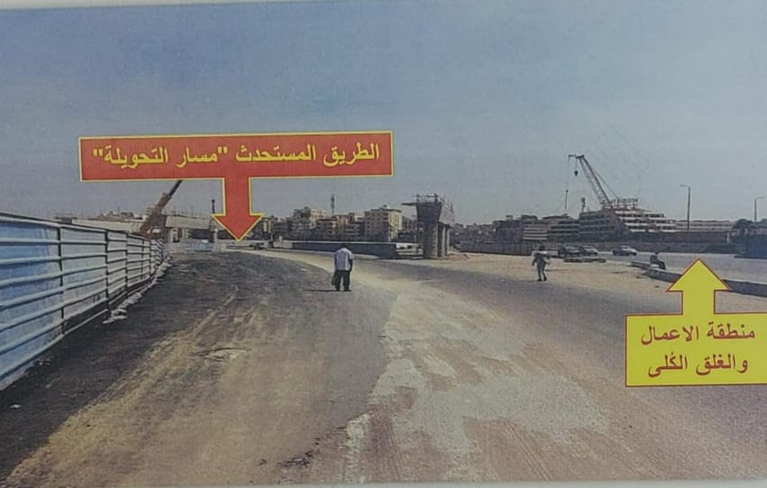 ٢- حركة سير المركبات بطريق الفيوم بالإتجاه القادم من طريق المنصورية وترغب بالسير اتجاه طريق الفيوم يتم الدخول يمينًا الى الطريق الذى تم استحداثه "الطريق البديل" ثم العودة مرة اخرى للطريق الاصلى عقب تجاوز منطقة الأعمال والغلق الكُلى.