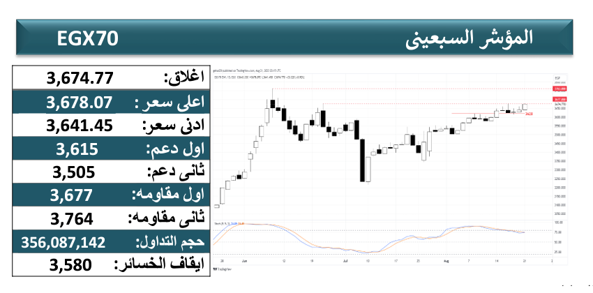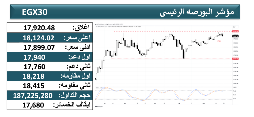 تراجع المؤشر الرئيسي EGX 30 بنحو 93.23 نقطة بنسبة هبوط 0.52% مسجلًا مستوى إغلاق عند 17920 نقطة بفضل الأداء المتباين والمتذبذب لأغلب الأسهم القيادية، ومن المتوقع أن نشهد خلال حركة تعاملات هذا الأسبوع حركة صاعدة تحاول اختراق مستوى المقاومة عند 18000 نقطة.