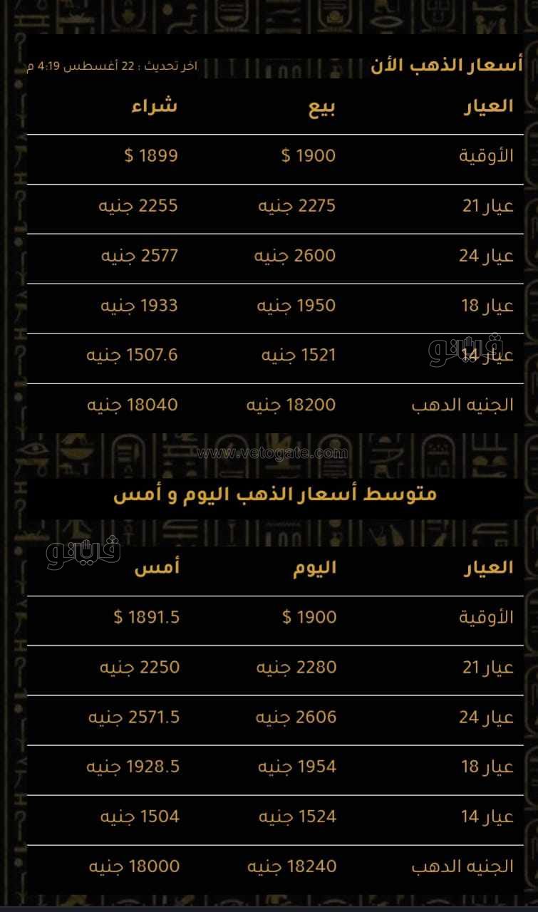وسجل سعر جرام الذهب عيار 18 في الأسواق نحو 1928 جنيها.