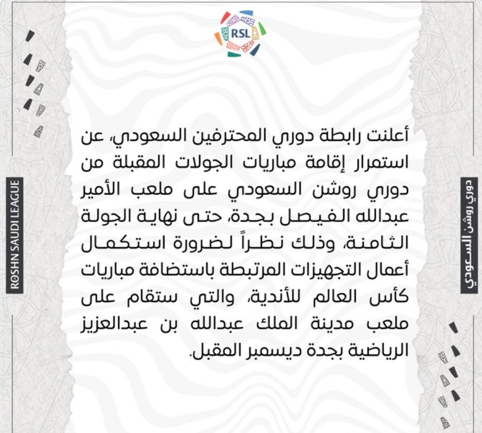 قررت رابطة أندية الدوري السعودي استقبال مباريات البطولة المحلية على ملعب واحد بمدينة جدة، بسبب بطولة كأس العالم للأندية.