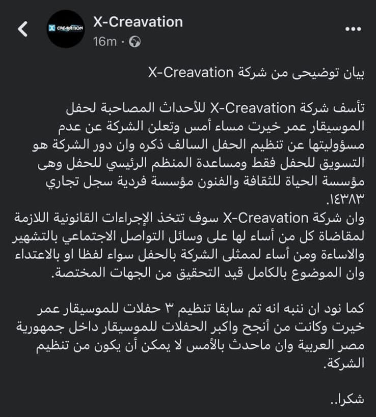 وجاء فى البيان: نأسف للأحداث المصاحبة لحفل الموسيقار عمر خيرت مساء أمس، وتعلن الشركة عن عدم مسؤوليتها عن تنظيم الحفل السالف ذكره وإن دور الشركة هو التسويق للحفل فقط ومساعدة المنظم الرئيسي للحفل، وهي مؤسسة الحياة للثقافة والفنون، مؤسسة فردية، وأن الشركة سوف تتخذ الإجراءات القانونية اللازمة لمقاضاة كل من أساء لها على وسائل التواصل الاجتماعي بالتشهير والإساءة، ومن أساء لممثلي الشركة بالحفل سواء لفظًا أو بالاعتداء وأن الموضوع بالكامل قيد التحقيق من الجهات المختصة..كما نود أن ننبه أنه تم سابقًا تنظيم 3 حفلات للموسيقار عمر خيرت وكانت من أنجح وأكبر الحفلات للموسيقار داخل جمهورية مصر العربية، وأن ما حدث بالأمس لا يمكن أن يكون من تنظيم الشركة".