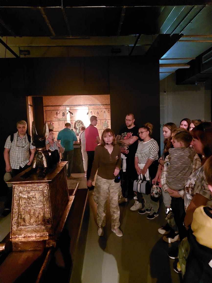 واستقبلت المرشدة السياحية الروسية إيرينا التي أجادت شرح تاريخ مصر الحضور لتبدأ رحلة الشرح لعدد 100 قطعة، وهي نسخ طبق الأصل للمقتنيات المعروضة في المتحف المصري بالقاهرة، صنعها مجموعة من الخبراء الروس في علم المصريات، حيث تم وضع تمثال لعالم الآثار البريطاني "هوارد كارتر" مكتشف المقبرة، ورجل الأعمال البريطاني اللورد "كارنافون".