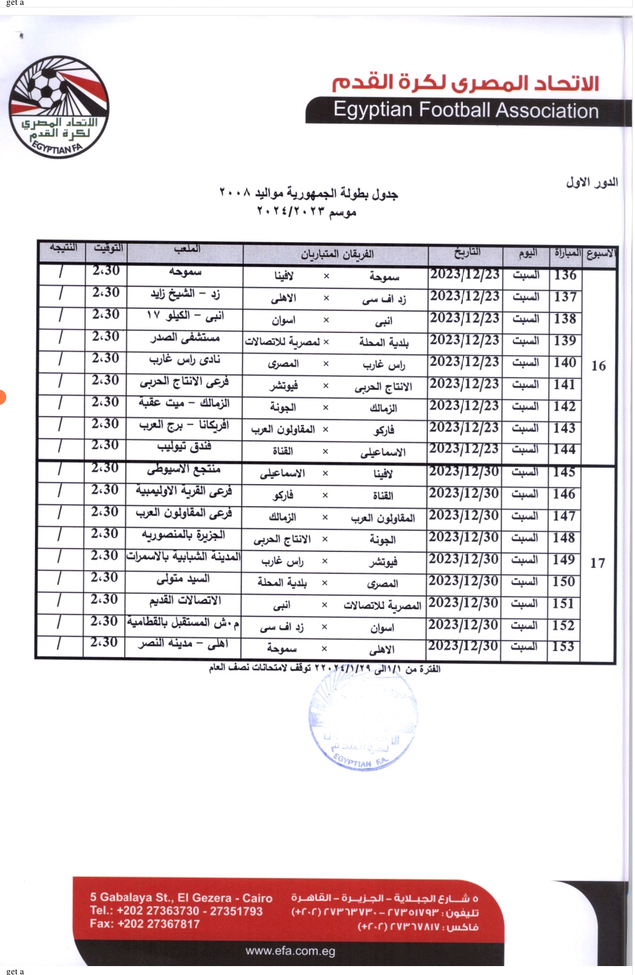 وأكد اتحاد الكرة في خطابه، عمل أشعة الرسخ لمواليد 2008 للاعبين الجدد الذين لم يتم عمل الأشعة لهم الموسم الماضي وجميع اللاعبين مواليد 2009.