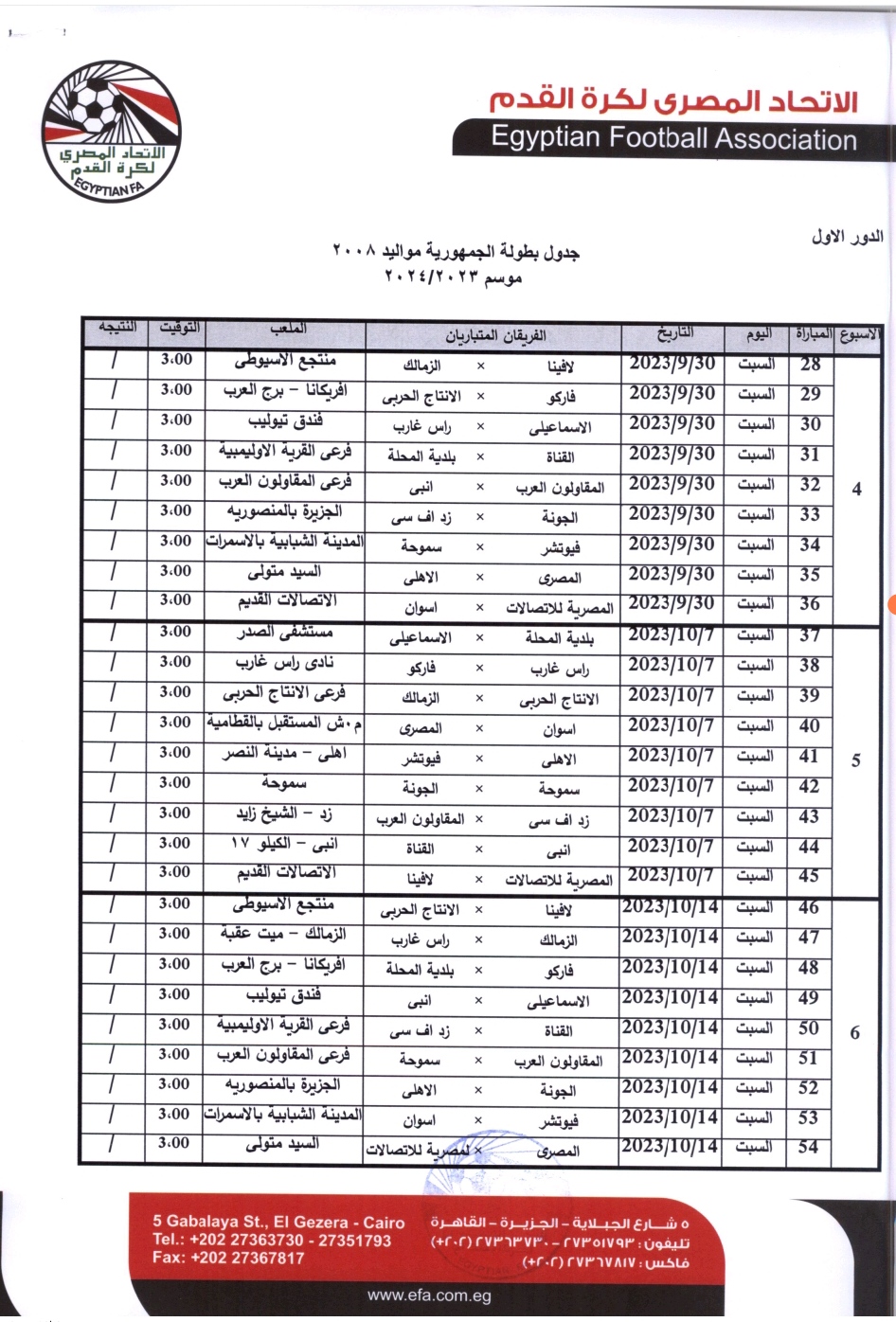 دوري الجمهورية للناشئين، كشف اتحاد الكرة عن مباريات دوري الجمهورية للناشئين لكرة القدم مواليد 2008 لأندية القسم الأول موسم 2023-2024.