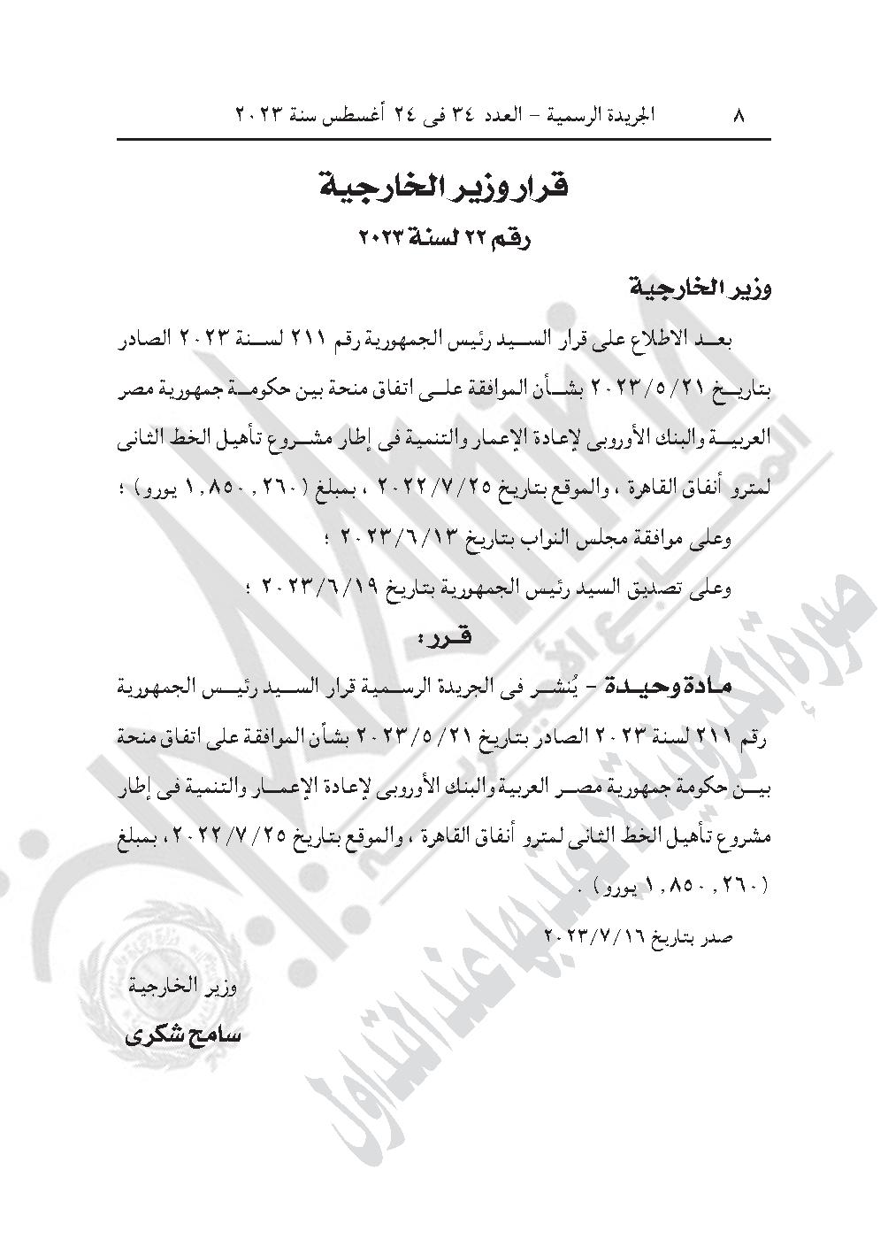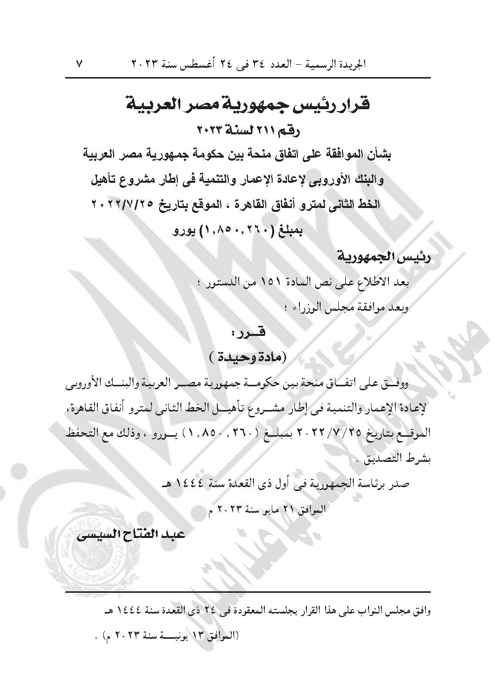 -قرار رئيس جمهورية مصر العربية رقم 211 لسنة 2023، بشأن الموافقة على اتفاق منحة بين حكومة جمهورية مصر العربية والبنك الأوروبى لإعادة الإعمار والتنمية فى إطار مشروع تأهيل الخط الثانى لمترو أنفاق القاهرة، الموقع بتاريخ 25/7/2022، بمبلغ 1٫850٫260 يورو.