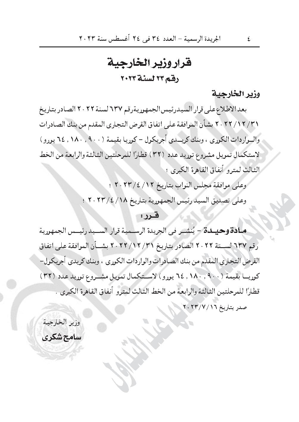 نشرت الجريدة الرسمية في عددها رقم 34، الصادر في 24 أغسطس 2023، 3 قرارات جمهورية للرئيس عبد الفتاح السيسي، بشأن الموافقة على اتفاق القرض التجاري المقدم من بنك الصادرات والواردات الكوري، الموافقة على التعديل الأول لاتفاق منحة المساعدة للخط الأول لمترو الأنفاق بالقاهرة، والموافقة على اتفاق منحة للخط الثاني لمترو الأنفاق.