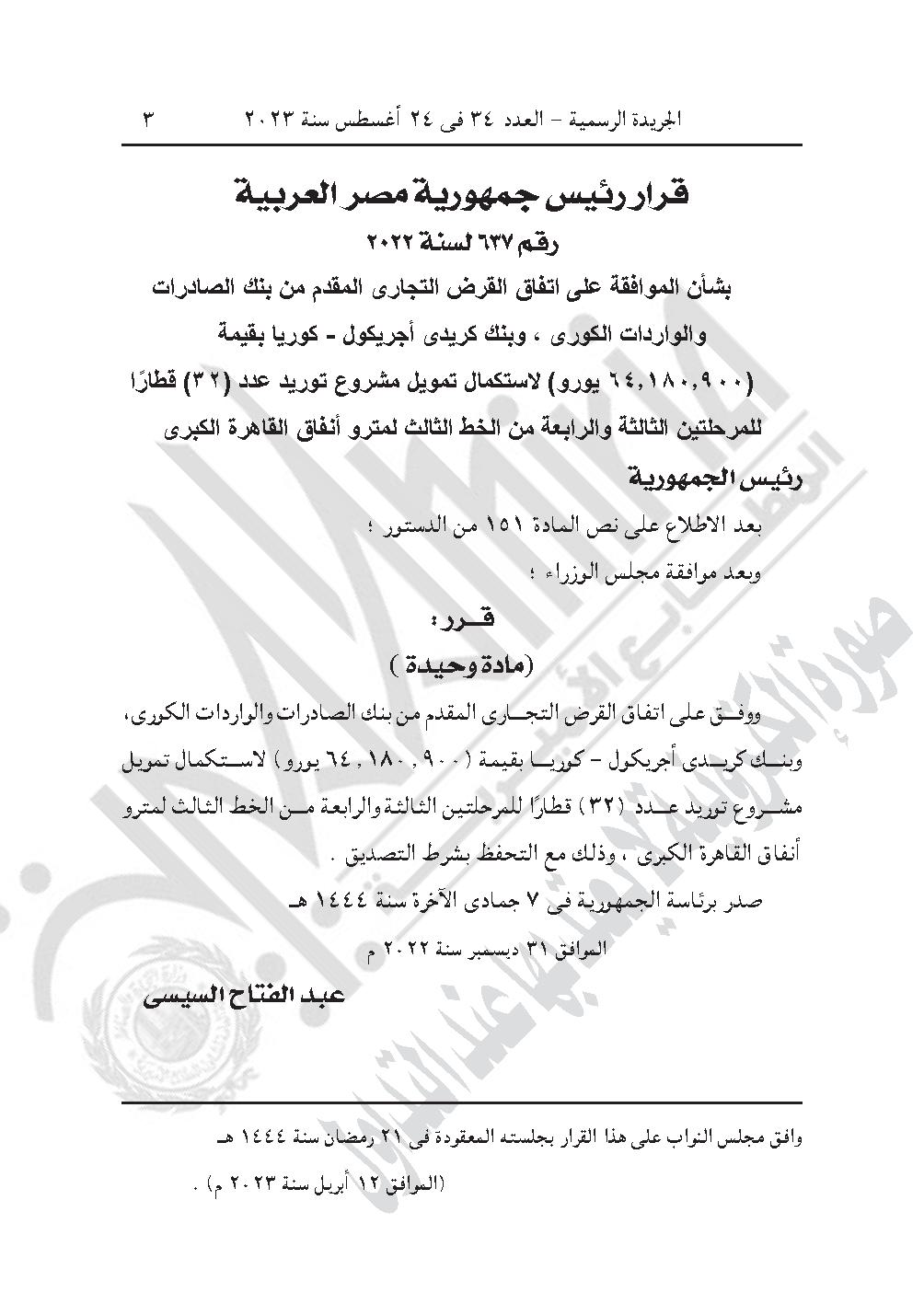 -قرار جمهوري رقم 637 لسنة 2022 بشأن الموافقة على اتفاق القرض التجاري المقدم من بنك الصادرات والواردات الكورى، وبنك كريدى أجريكول- كوريا بقيمة 64.180.900 يورو، لاستكمال تمويل مشروع توريد (32) قطارًا، للمرحلتين الثالثة والرابعة من الخط الثالث لمترو أنفاق القاهرة الكبرى.