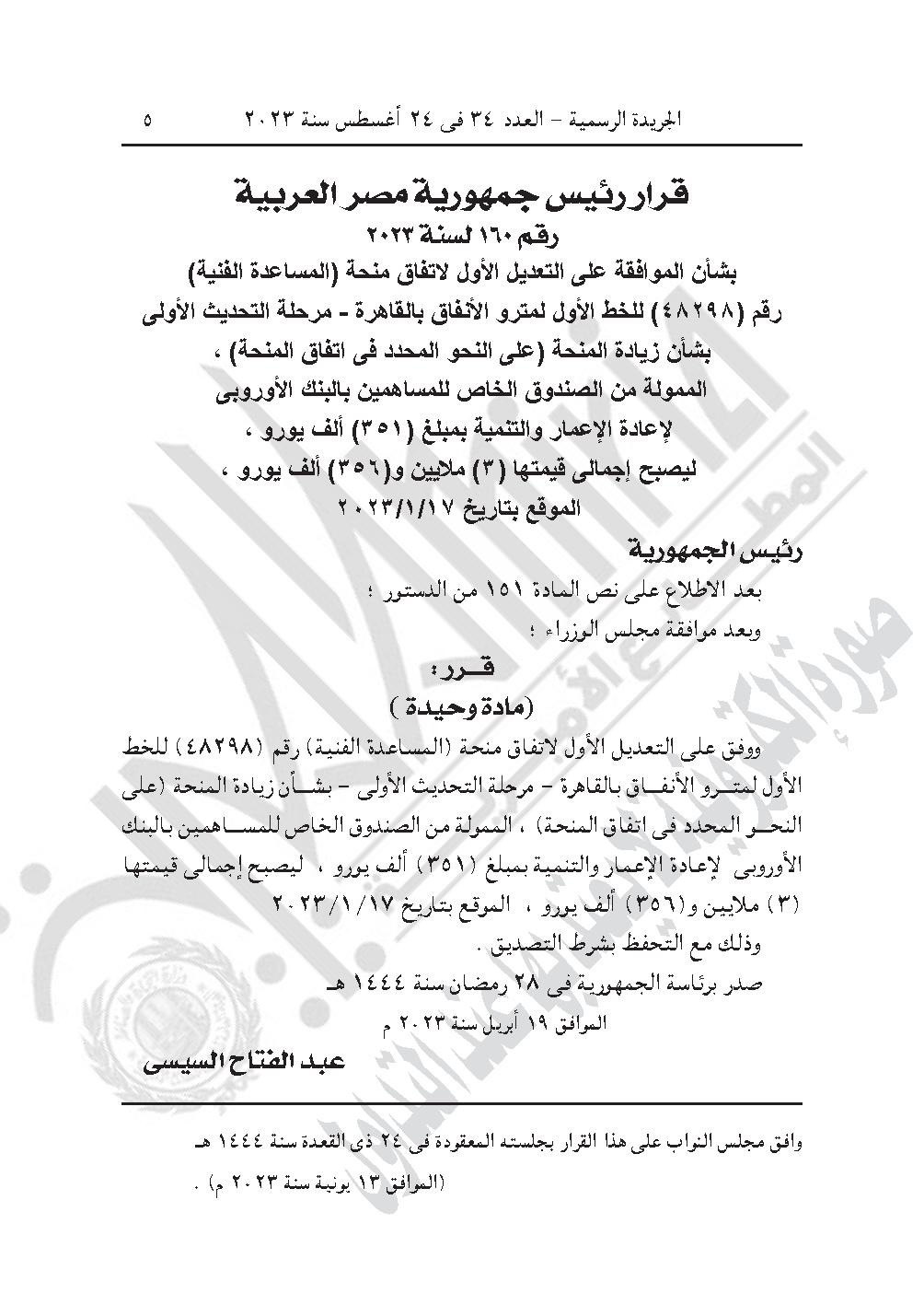 -قرار رئيس جمهورية مصر العربية رقم 160 لسنة 2023، بشأن الموافقة على التعديل الأول لاتفاق منحة المساعدة الفنية رقم (48298) للخط الأول لمترو الأنفاق بالقاهرة- مرحلة التحديث الأولى بشأن زيادة المنحة، على النحو المحدد فى اتفاق المنحة، الممولة من الصندوق الخاص للمساهمين بالبنك الأوروبي لإعادة الإعمار والتنمية بمبلغ (351) ألف يورو، ليصبح إجمالى قيمتها 3 ملايين و356 ألف يورو.