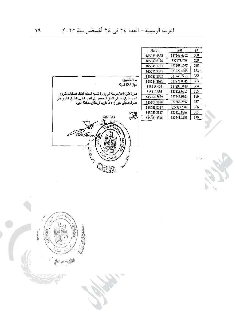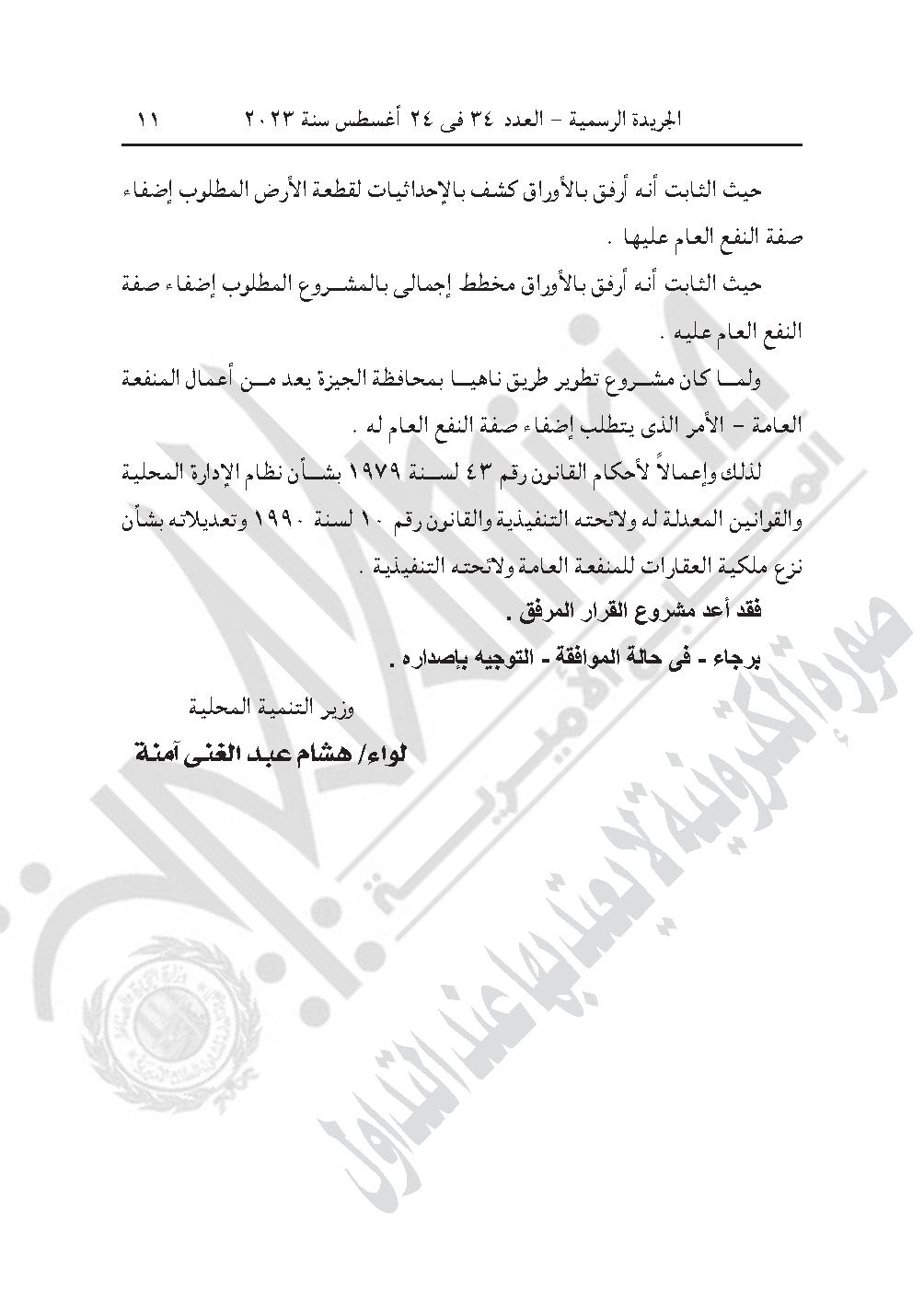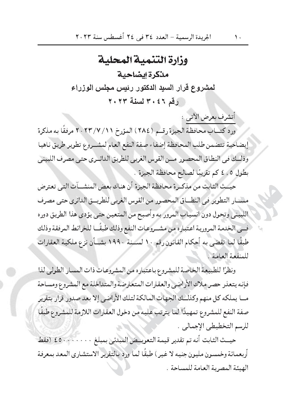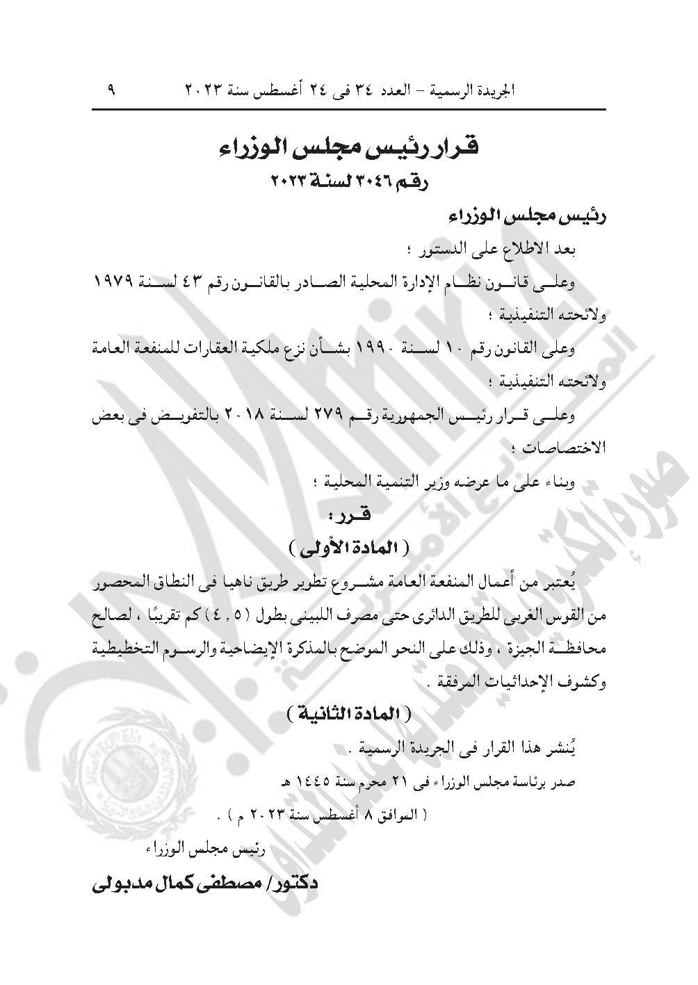 -قرار رئيس مجلس الوزراء رقـم 3046 لسنـة 2023، بشأن اعتبار مشروع تطوير طريق ناهيا فى النطاق المحصور من القوس الغربى للطريق الدائرى حتى مصرف اللبينى بطول (5.4) كم تقريبًا، لصالح محافظة الجيزة، من أعمال المنفعة العامة، وذلك على النحو الموضح بالمذكرة الإيضاحية والرسوم التخطيطية وكشوف الإحداثيات.