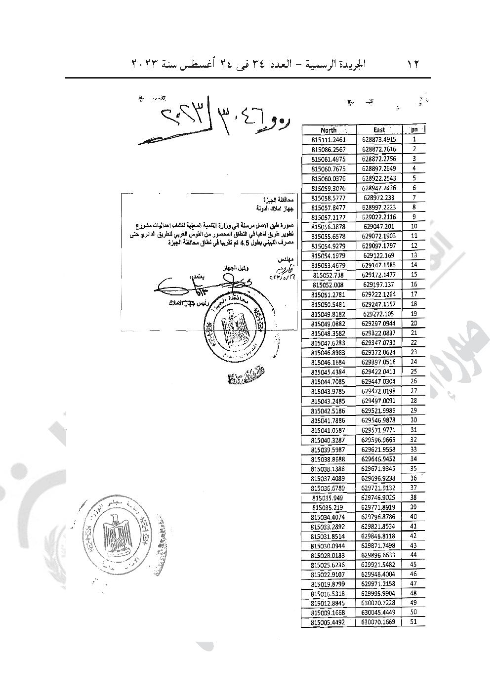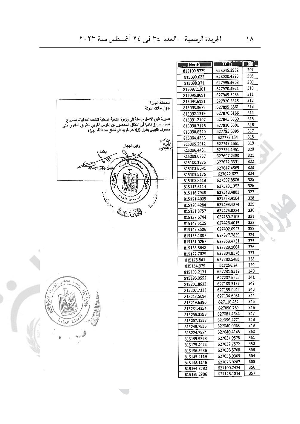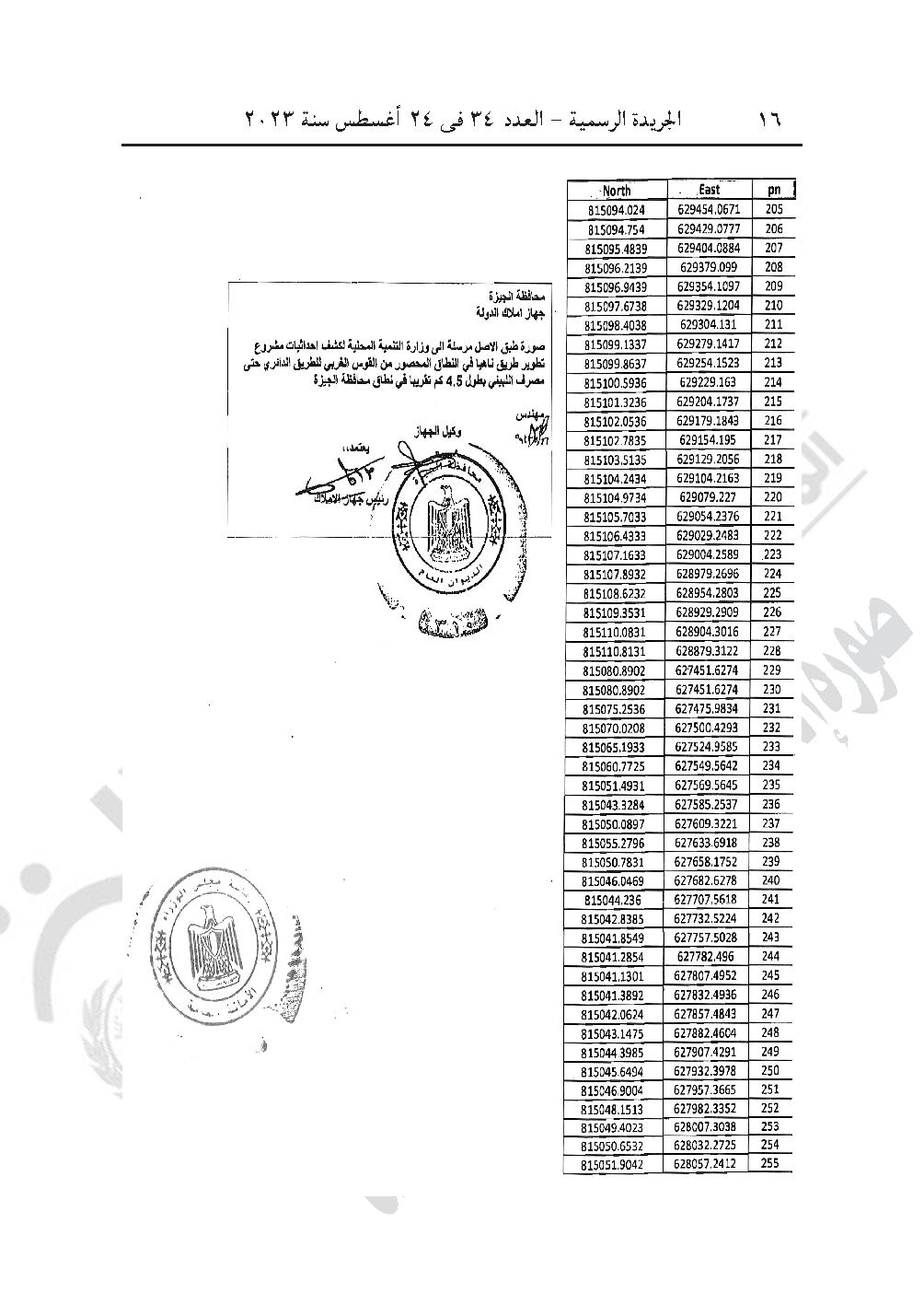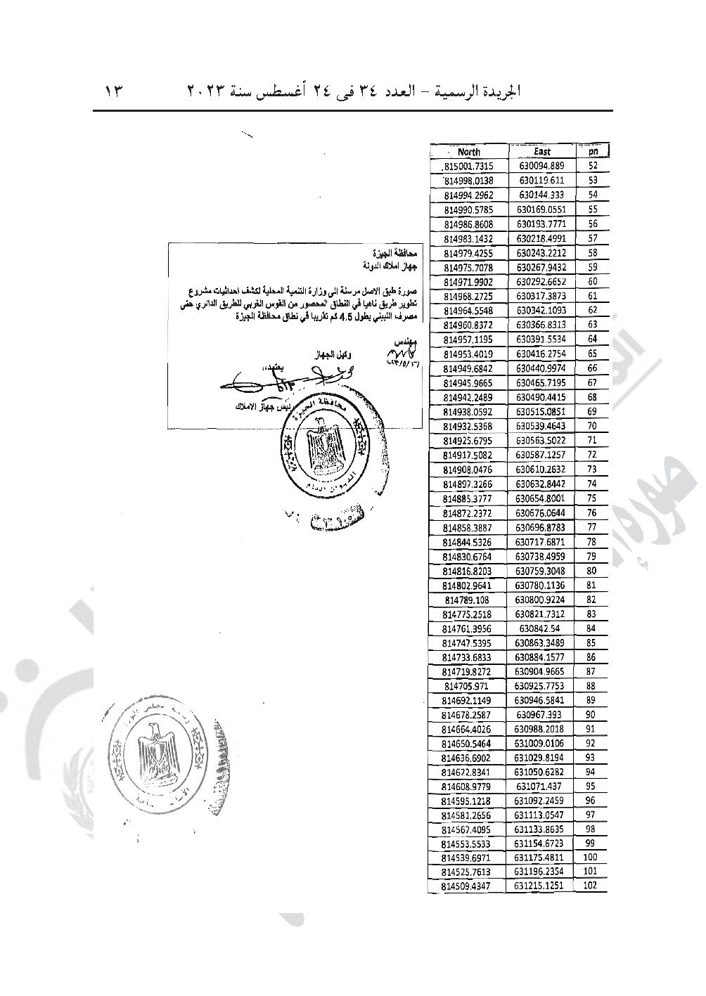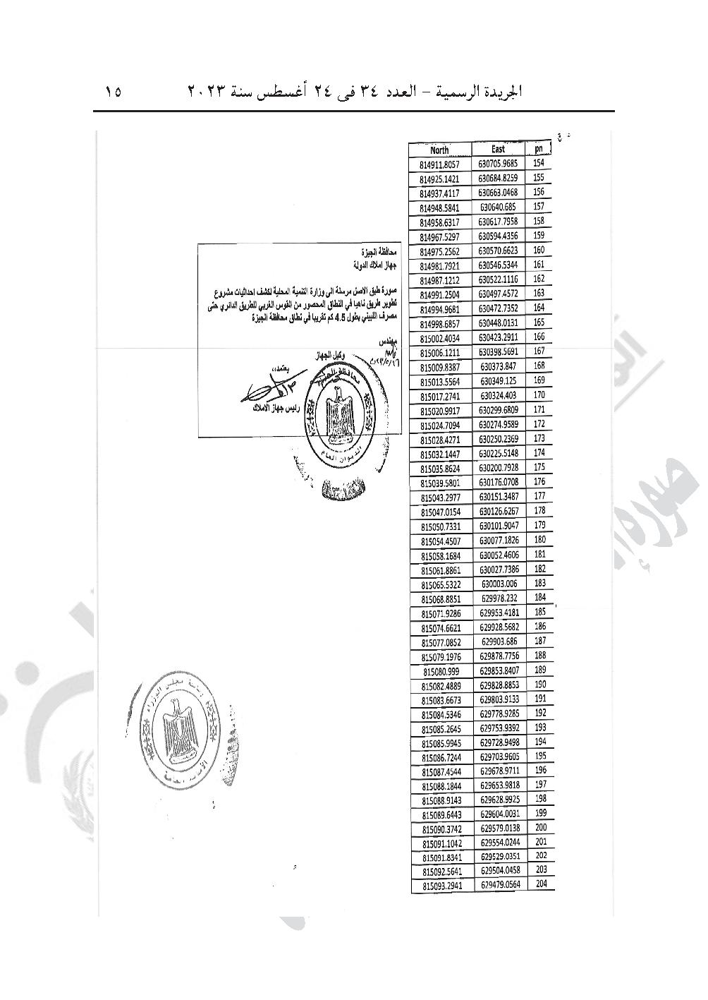 -قرار رئيس مجلس الوزراء رقـم 3046 لسنـة 2023، بشأن اعتبار مشروع تطوير طريق ناهيا فى النطاق المحصور من القوس الغربى للطريق الدائرى حتى مصرف اللبينى بطول (5.4) كم تقريبًا، لصالح محافظة الجيزة، من أعمال المنفعة العامة، وذلك على النحو الموضح بالمذكرة الإيضاحية والرسوم التخطيطية وكشوف الإحداثيات.