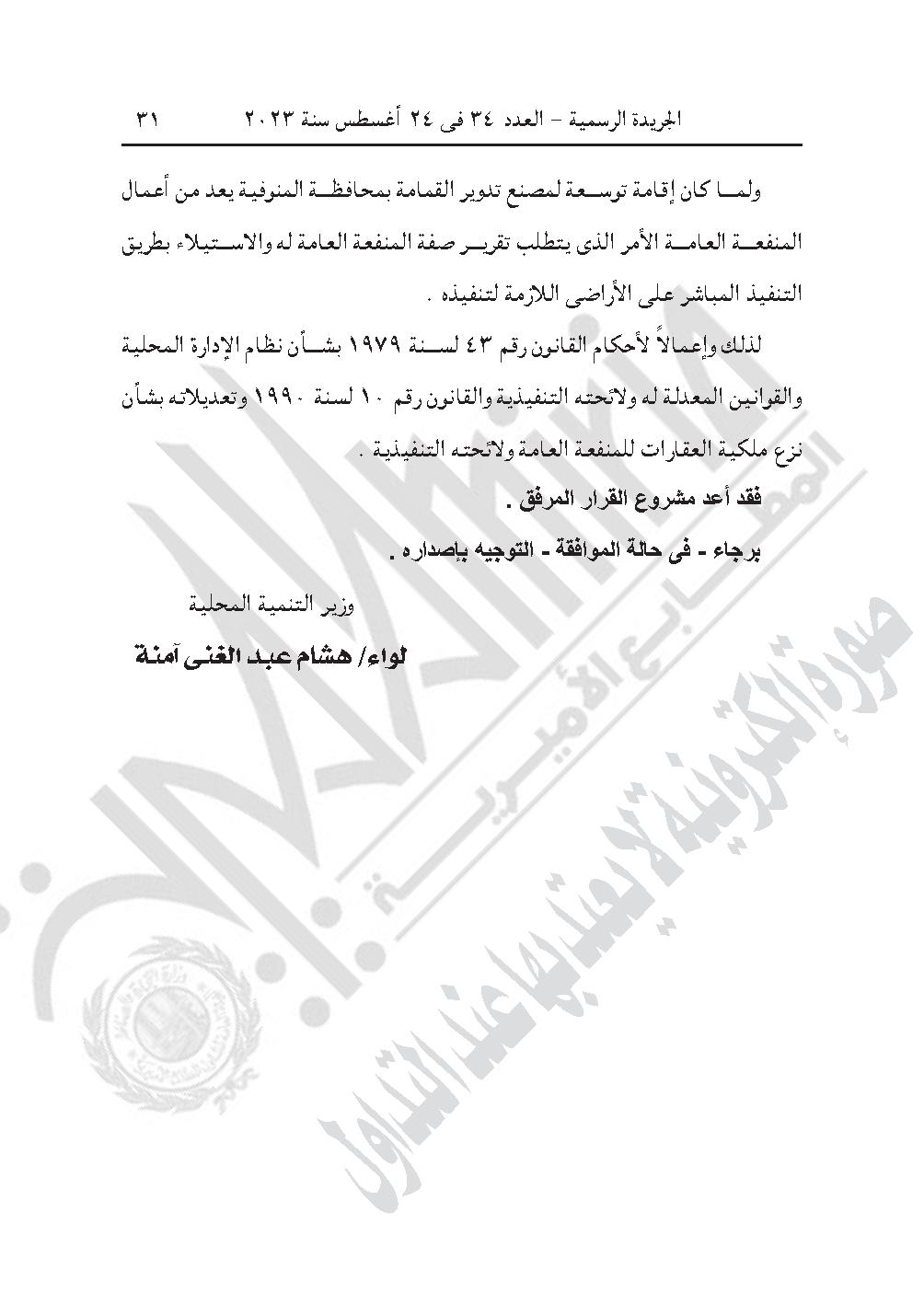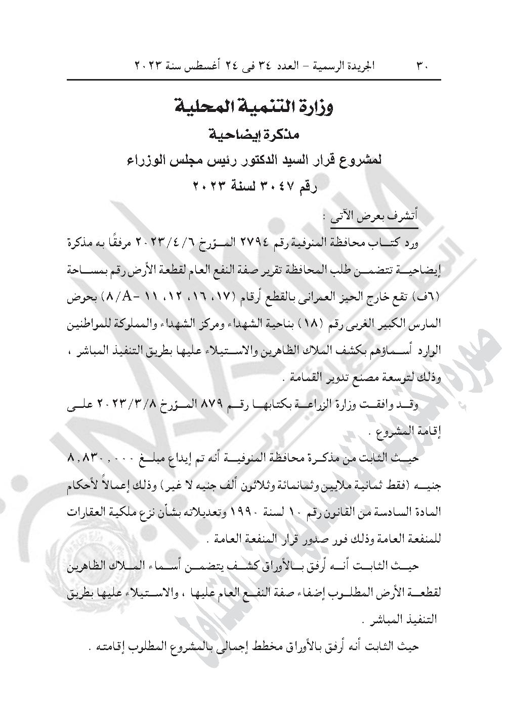 -وقرار رئيس مجلس الوزراء رقـم 3047 لسنـة 2023، باعتبار مشروع توسعة مصنع تدوير القمامة بمدينة الشهداء، مركز الشهداء محافظة المنوفية، من أعمال المنفعة العامة.
