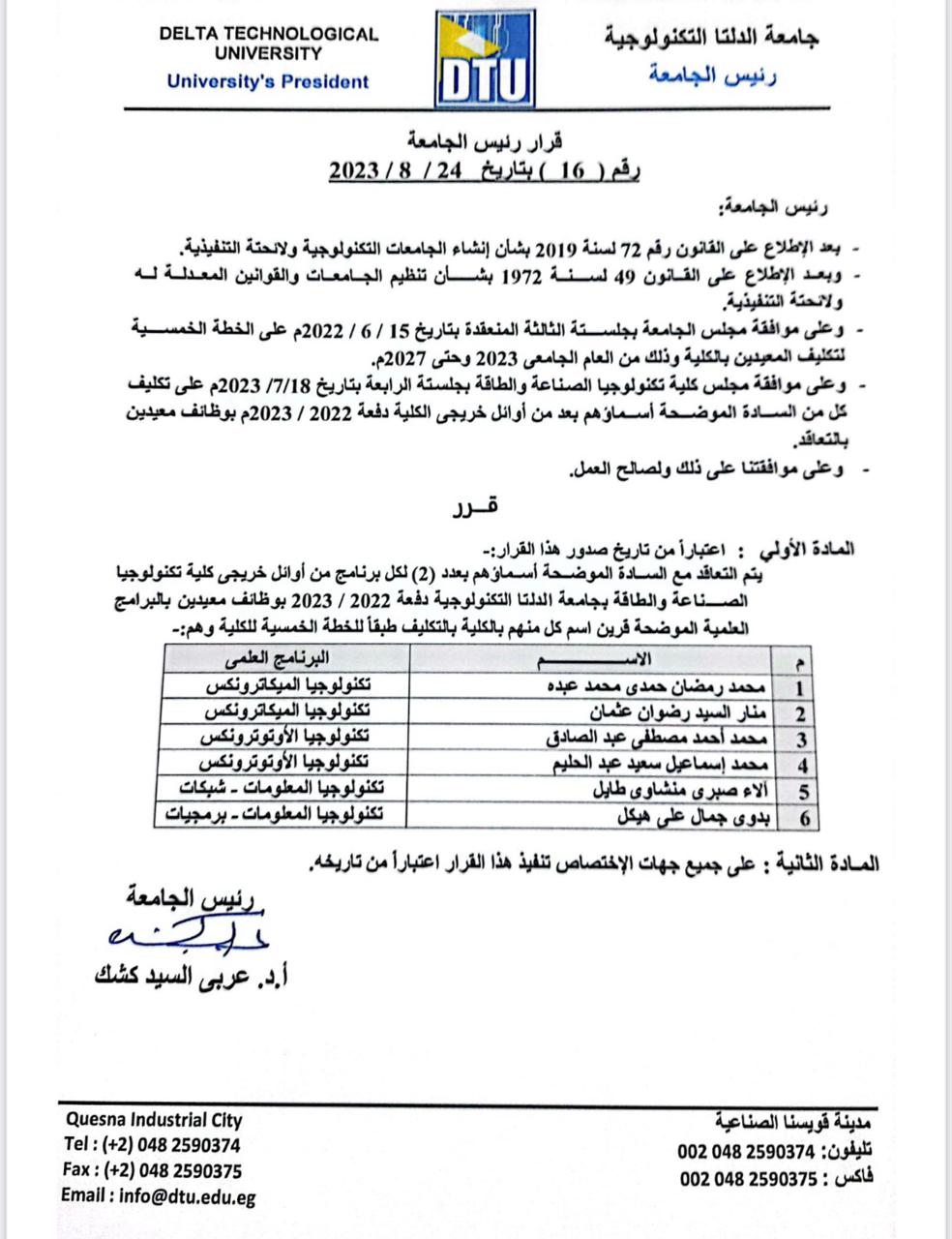 قدم الدكتور عربي السيد كشك، رئيس جامعة الدلتا التكنولوجية، التهاني إلى أوائل أولى دفعات الجامعة، وصدق على تعيين ٦ منهم معيدين بالجامعة، بواقع ٢ لكل قسم من الأقسام الثلاثة التي بدأت بها الجامعة أولى دفعاتها وهي برنامج تكنولوجيا الميكاترونكس، وتكنولوجيا الأوتوترونكس، وبرنامج تكنولوجيا المعلومات.