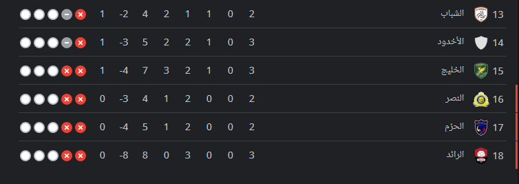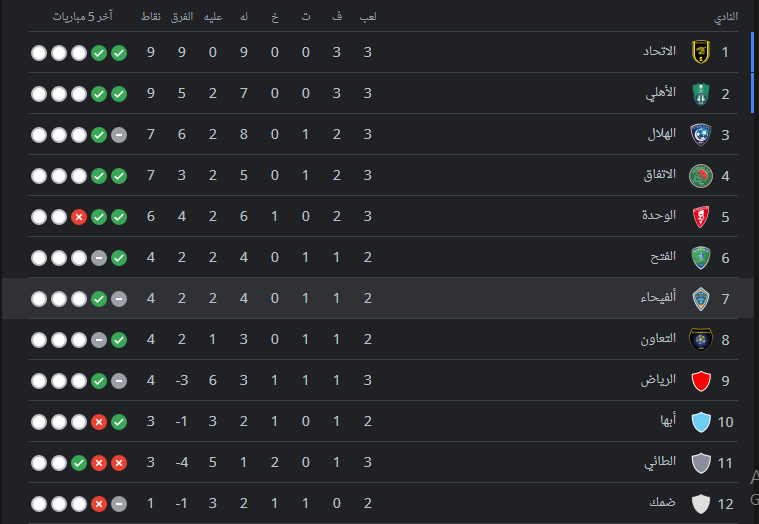 وجاء ترتيب الدوري السعودي بعد ختام مباريات اليوم كالتالي: