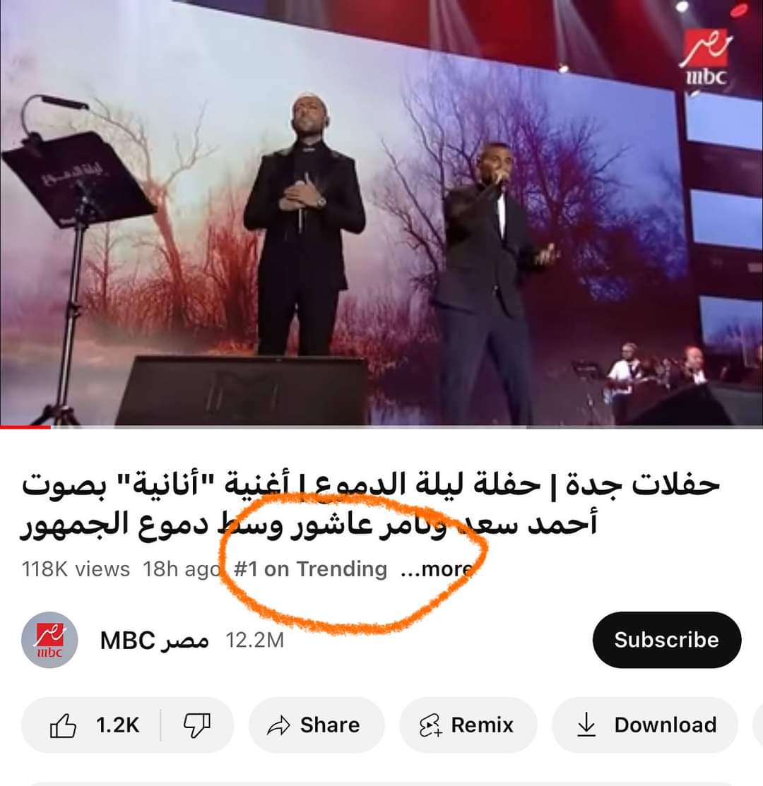 حفل ليلة الدموع، دويتو أحمد سعد وتامر عاشور يتصدر تريند يوتيوب (فيديو)