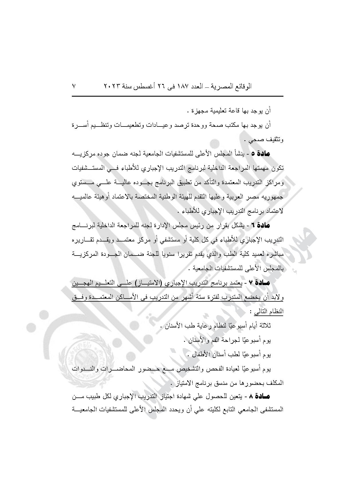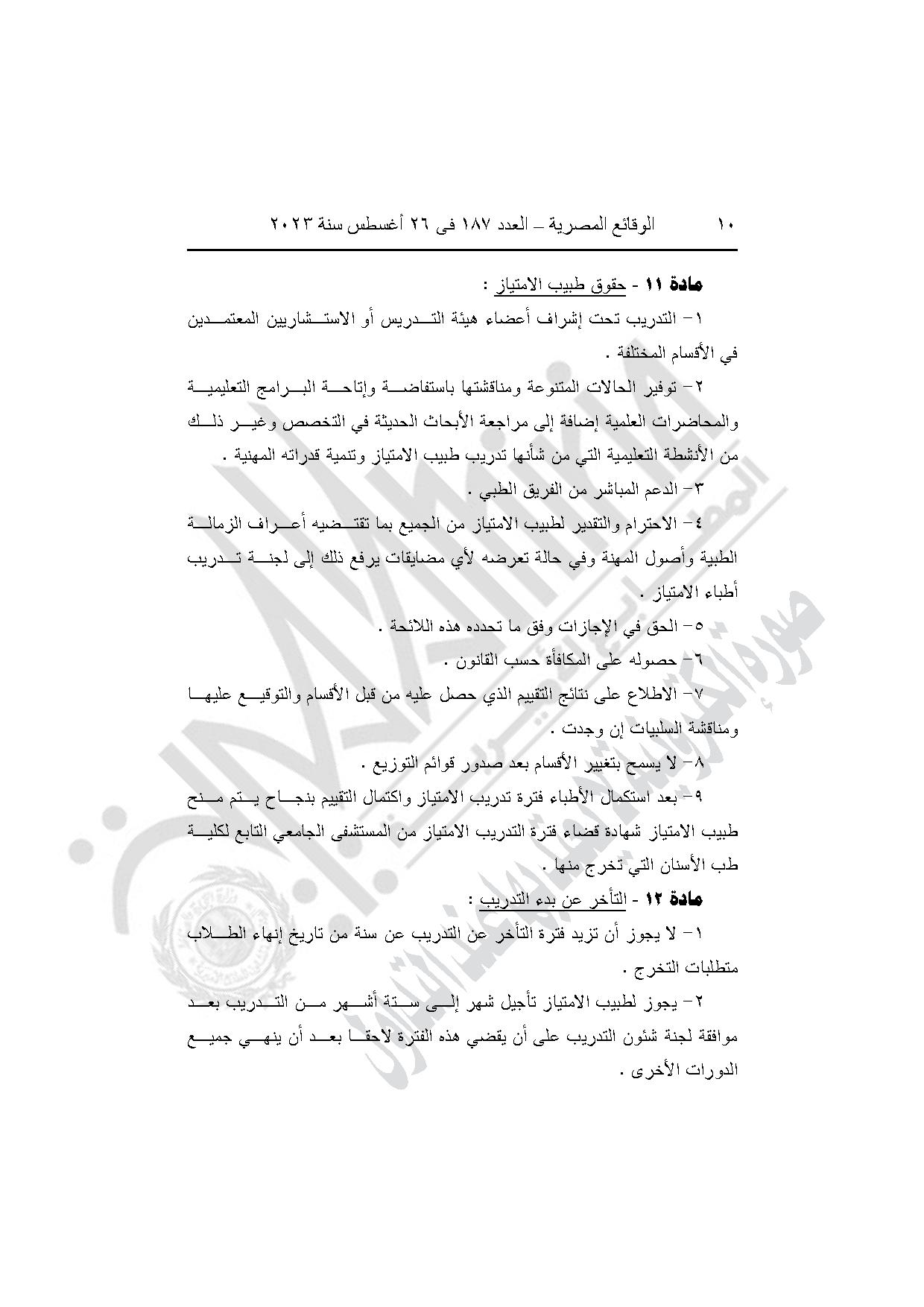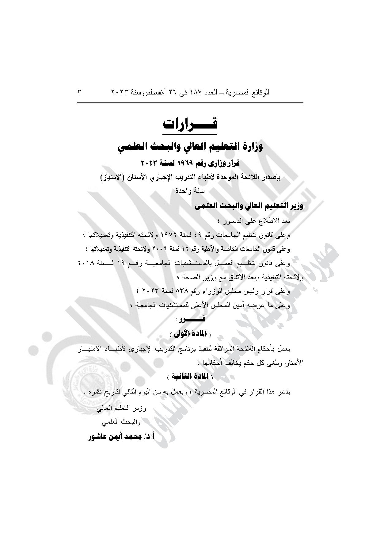 نشرت جريدة الوقائع المصرية في عددها رقم 187، الصادر في 26 أغسطس 2023، قرار وزارة التعليم العالي والبحث العلمي رقم 1969 لسنة 2023، بشأن إصدار اللائحة الموحدة لأطباء التدريب الإجباري الأسنان (الامتياز) سنة واحدة.