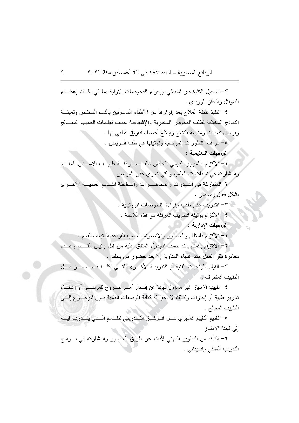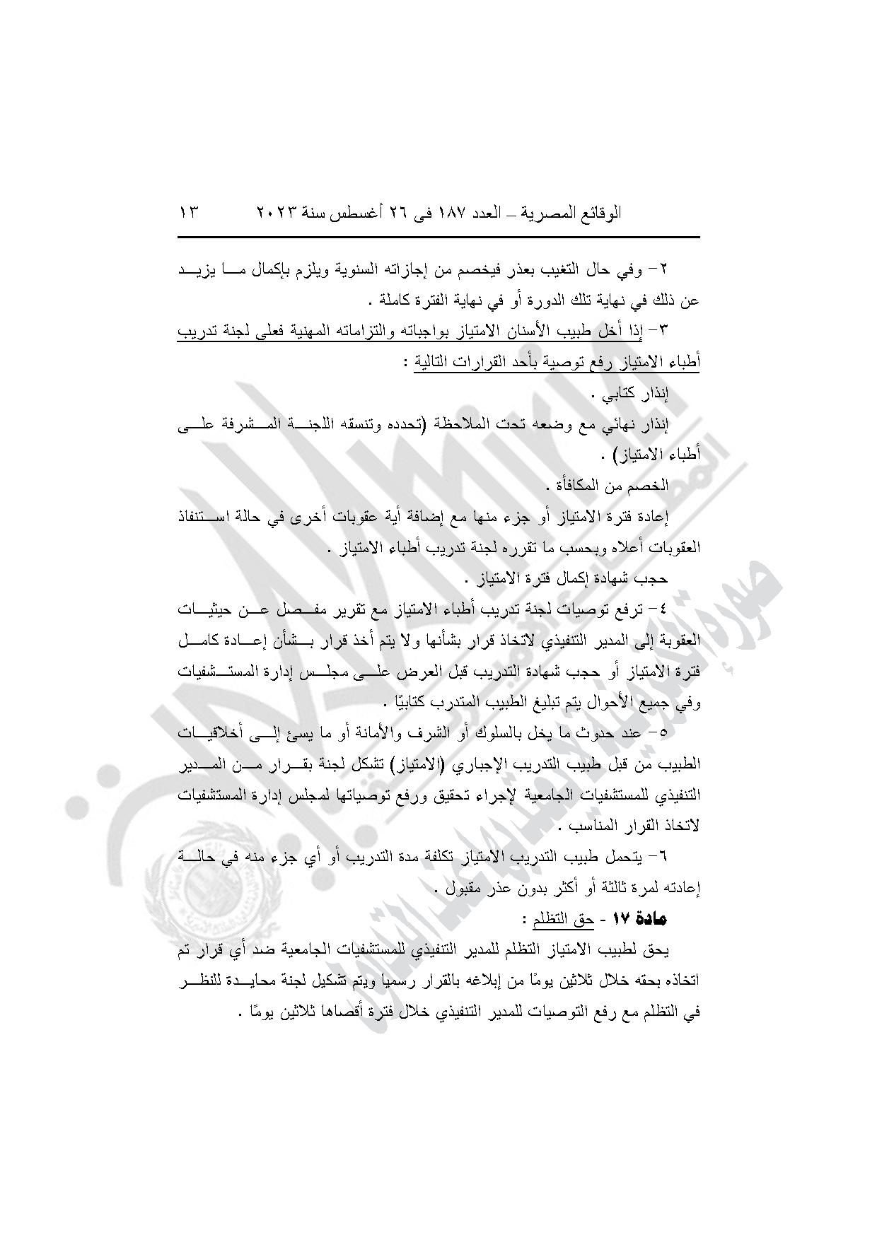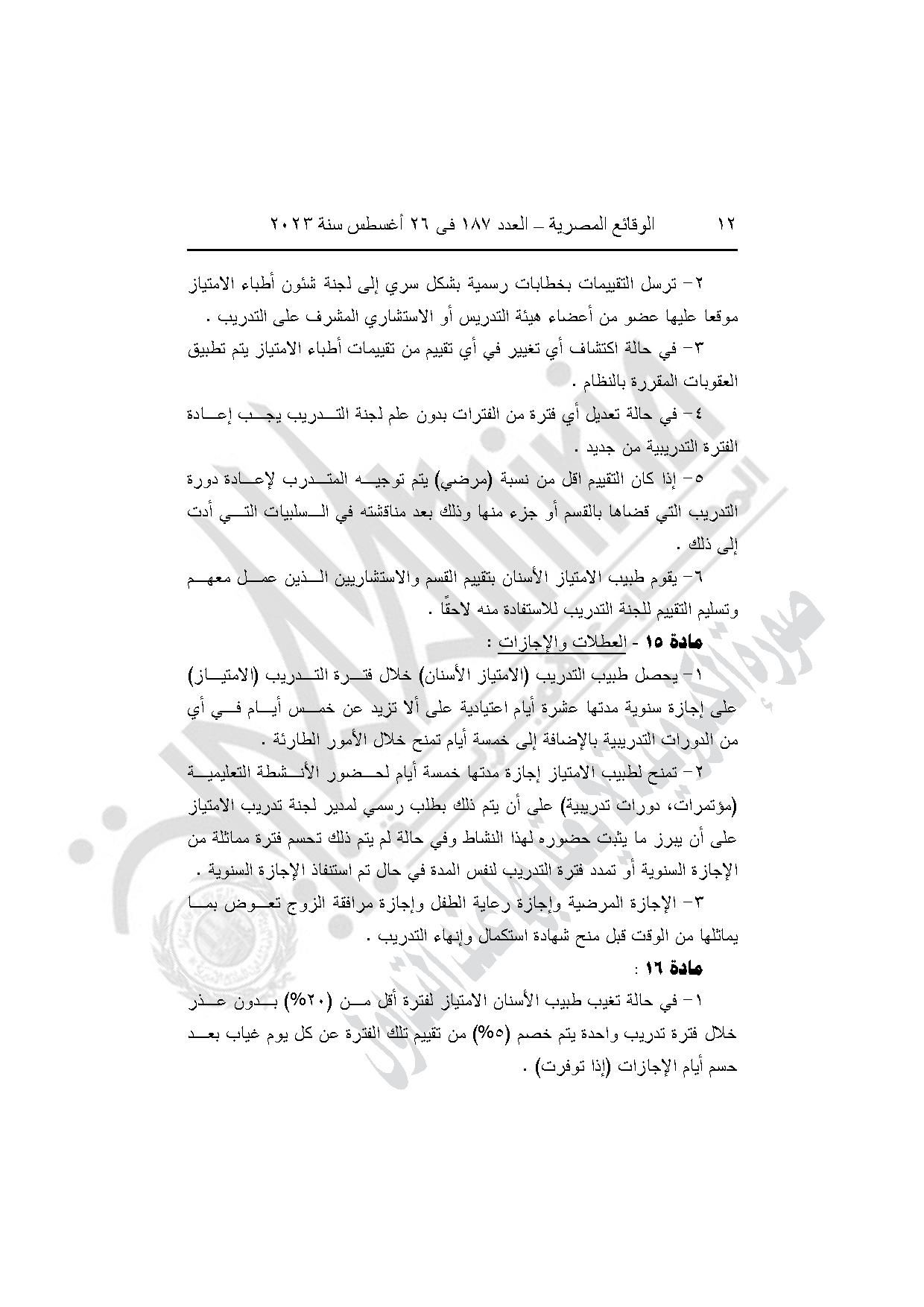 نشرت جريدة الوقائع المصرية في عددها رقم 187، الصادر في 26 أغسطس 2023، قرار وزارة التعليم العالي والبحث العلمي رقم 1969 لسنة 2023، بشأن إصدار اللائحة الموحدة لأطباء التدريب الإجباري الأسنان (الامتياز) سنة واحدة.