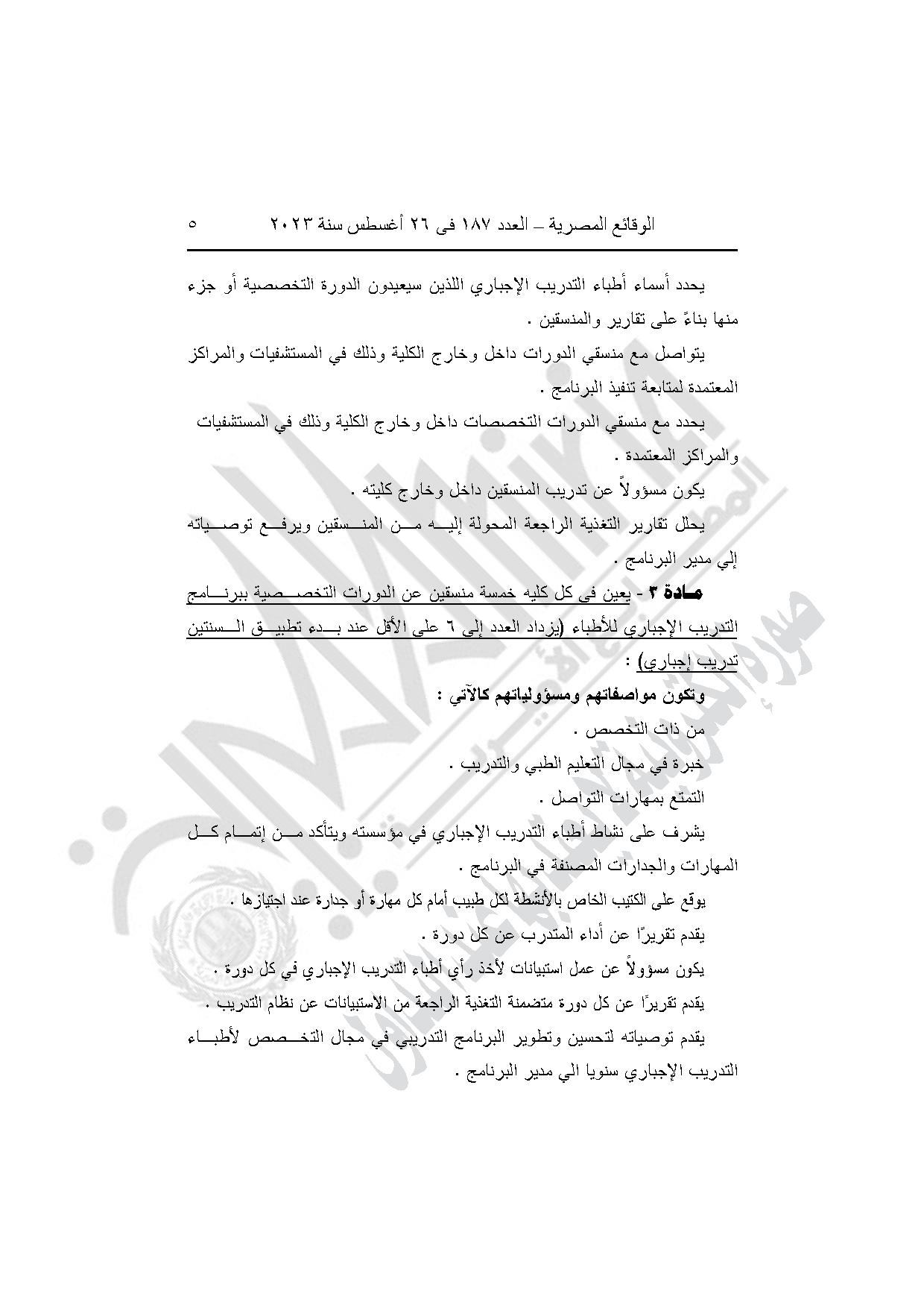 ويعين في كل كلية خمسة منسقين عن الدورات التخصـصية ببرنـامج التدريب الإجباري للأطباء (يزداد العدد إلى ٦ على الأقل عند بـدء تطبيـق الـسنتين تدريب إجباري).