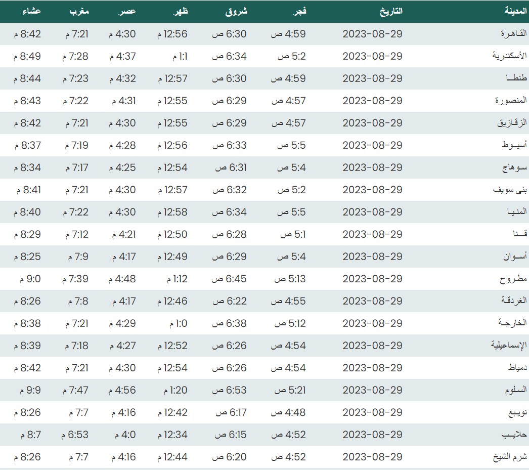 مواقيت الصلاة اليوم وفقًا للتوقيت المحلي لمدينتي القاهرة والإسكندرية وعدد من مدن ومحافظات الجمهورية من واقع بيانات الهيئة العامة للمساحة