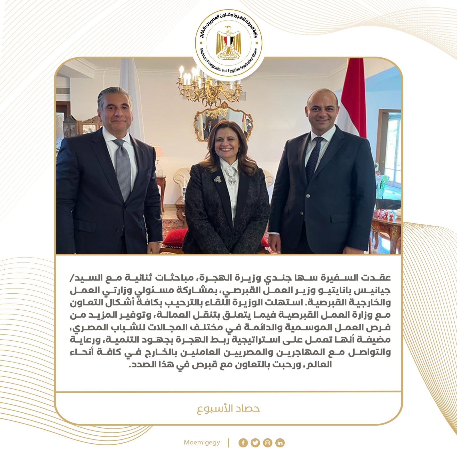 وعقدت السفيرة سها جندي وزيرة الهجرة، مباحثات ثنائية مع جيانيس بانايتيو وزير العمل القبرصي، بمشاركة مسئولي وزارتي العمل والخارجية القبرصية. استهلت الوزيرة اللقاء بالترحيب بكافة أشكال التعاون مع وزارة العمل القبرصية فيما يتعلق بتنقل العمالة، وتوفير المزيد من فرص العمل الموسمية والدائمة في مختلف المجالات للشباب المصري، مضيفة أنها تعمل على استراتيجية ربط الهجرة بجهود التنمية، ورعاية والتواصل مع المهاجرين والمصريين العاملين بالخارج في كافة أنحاء العالم، ورحبت بالتعاون مع قبرص في هذا الصدد.