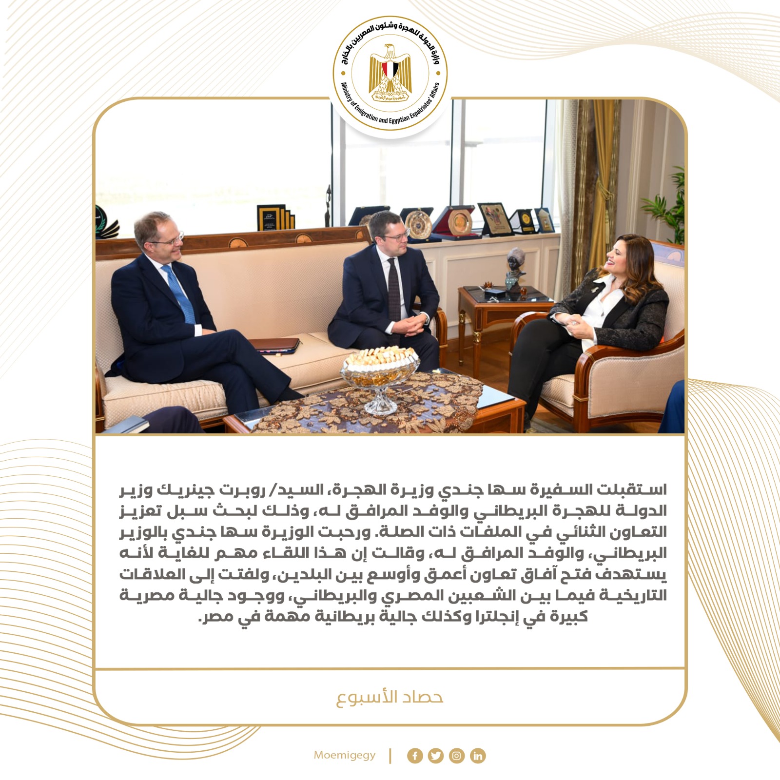 واستقبلت السفيرة سها جندي وزيرة الهجرة، روبرت جينريك وزير الدولة للهجرة البريطاني والوفد المرافق له، وذلك لبحث سبل تعزيز التعاون الثنائي في الملفات ذات الصلة. ورحبت الوزيرة سها جندي بالوزير البريطاني، والوفد المرافق له، وقالت إن هذا اللقاء مهم للغاية لأنه يستهدف فتح آفاق تعاون أعمق وأوسع بين البلدين، ولفتت إلى العلاقات التاريخية فيما بين الشعبين المصري والبريطاني، ووجود جالية مصرية كبيرة في إنجلترا وكذلك جالية بريطانية مهمة في مصر.