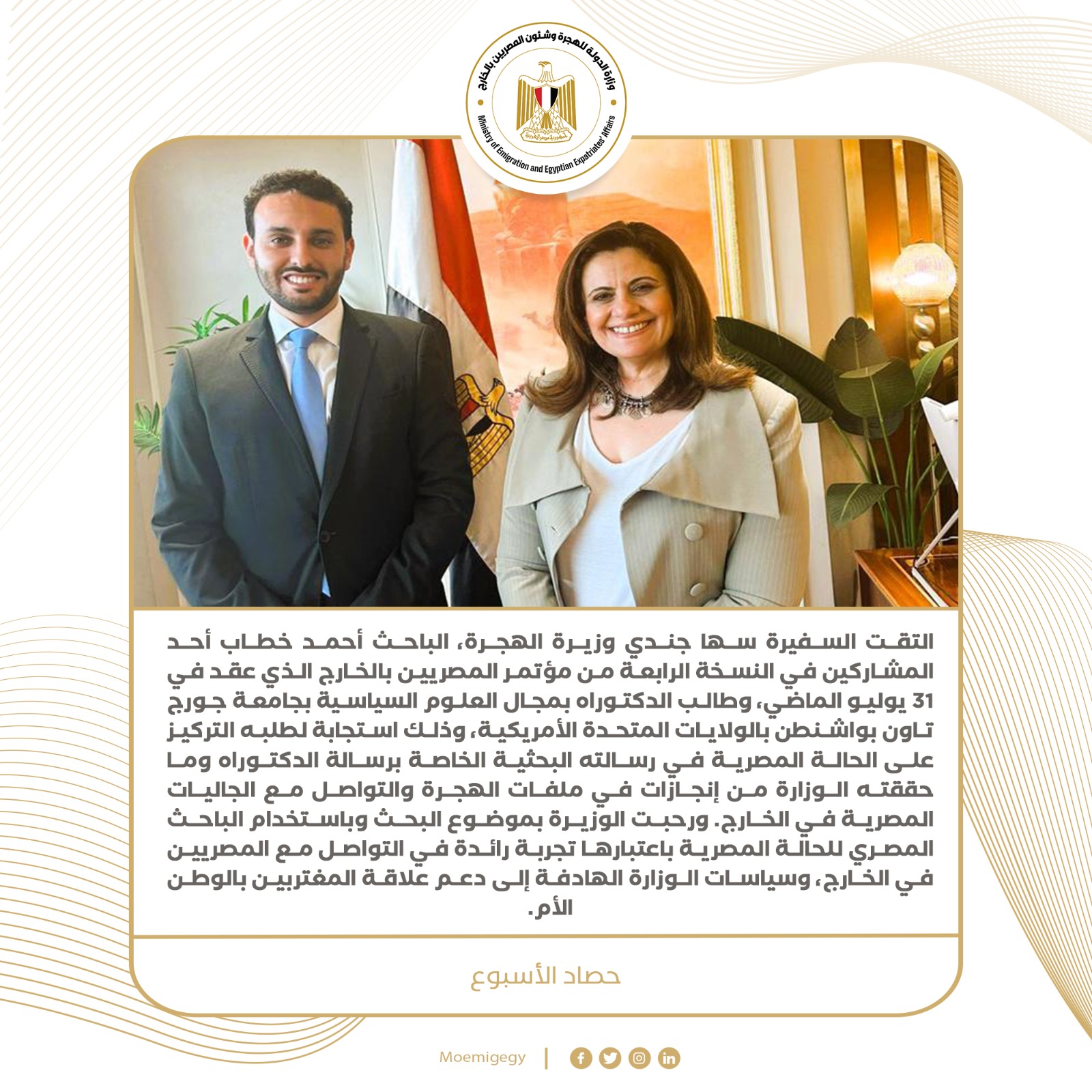 والتقت السفيرة سها جندي وزيرة الهجرة، الباحث أحمد خطاب أحد المشاركين في النسخة الرابعة من مؤتمر المصريين بالخارج الذي عقد في 31 يوليو الماضي، وطالب الدكتوراه بمجال العلوم السياسية بجامعة جورج تاون بواشنطن بالولايات المتحدة الأمريكية، وذلك استجابة لطلبه التركيز على الحالة المصرية في رسالته البحثية الخاصة برسالة الدكتوراه وما حققته الوزارة من إنجازات في ملفات الهجرة والتواصل مع الجاليات المصرية في الخارج.