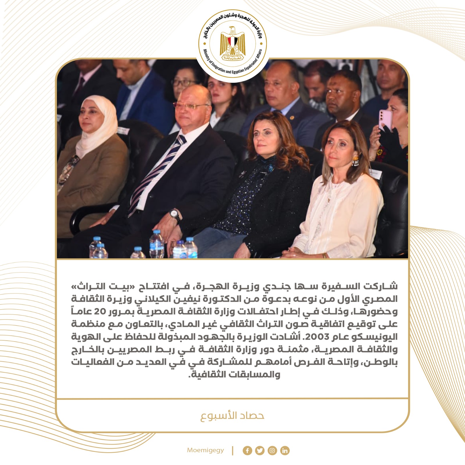 وشاركت السفيرة سها جندي وزيرة الهجرة، في افتتاح «بيت التراث» المصري الأول من نوعه بدعوة من الدكتورة نيفين الكيلاني وزيرة الثقافة وحضورها، وذلك في إطار احتفالات وزارة الثقافة المصرية بمرور 20 عامًا على توقيع اتفاقية صون التراث الثقافي غير المادي، بالتعاون مع منظمة اليونيسكو عام 2003.