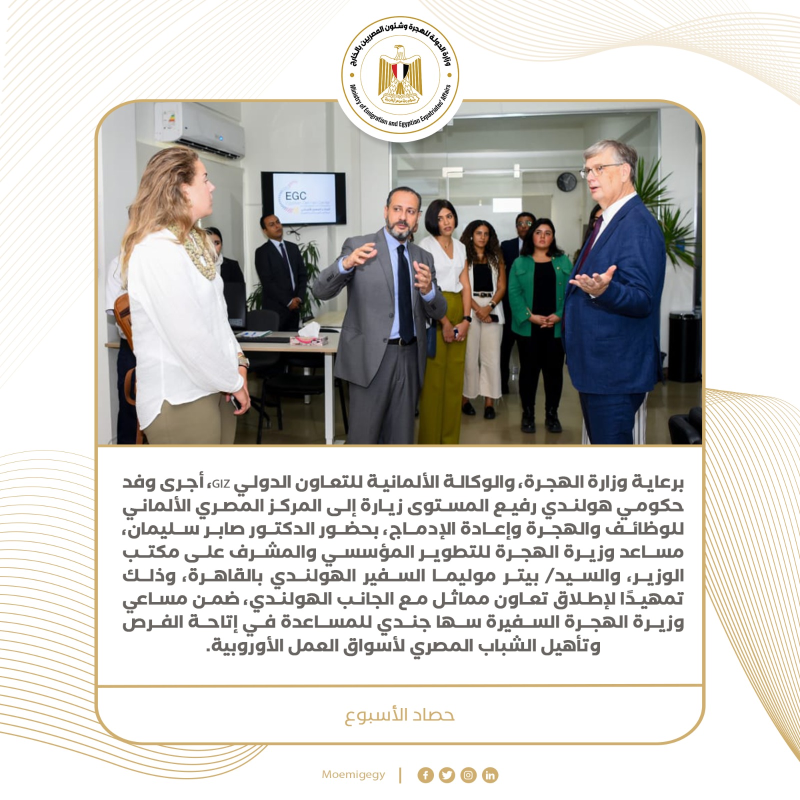 و برعاية وزارة الدولة للهجرة وشئون المصريين بالخارج، والوكالة الألمانية للتعاون الدولي GIZ، أجرى وفد حكومي هولندي رفيع المستوى زيارة إلى المركز المصري الألماني للوظائف والهجرة وإعادة الإدماج، بحضور الدكتور صابر سليمان، مساعد وزيرة الهجرة للتطوير المؤسسي والمشرف على مكتب الوزير، وبيتر موليما السفير الهولندي بالقاهرة، وذلك تمهيدًا لإطلاق تعاون مماثل مع الجانب الهولندي، ضمن مساعي وزيرة الهجرة السفيرة سها جندي للمساعدة في إتاحة الفرص وتأهيل الشباب المصري لأسواق العمل الأوروبية.