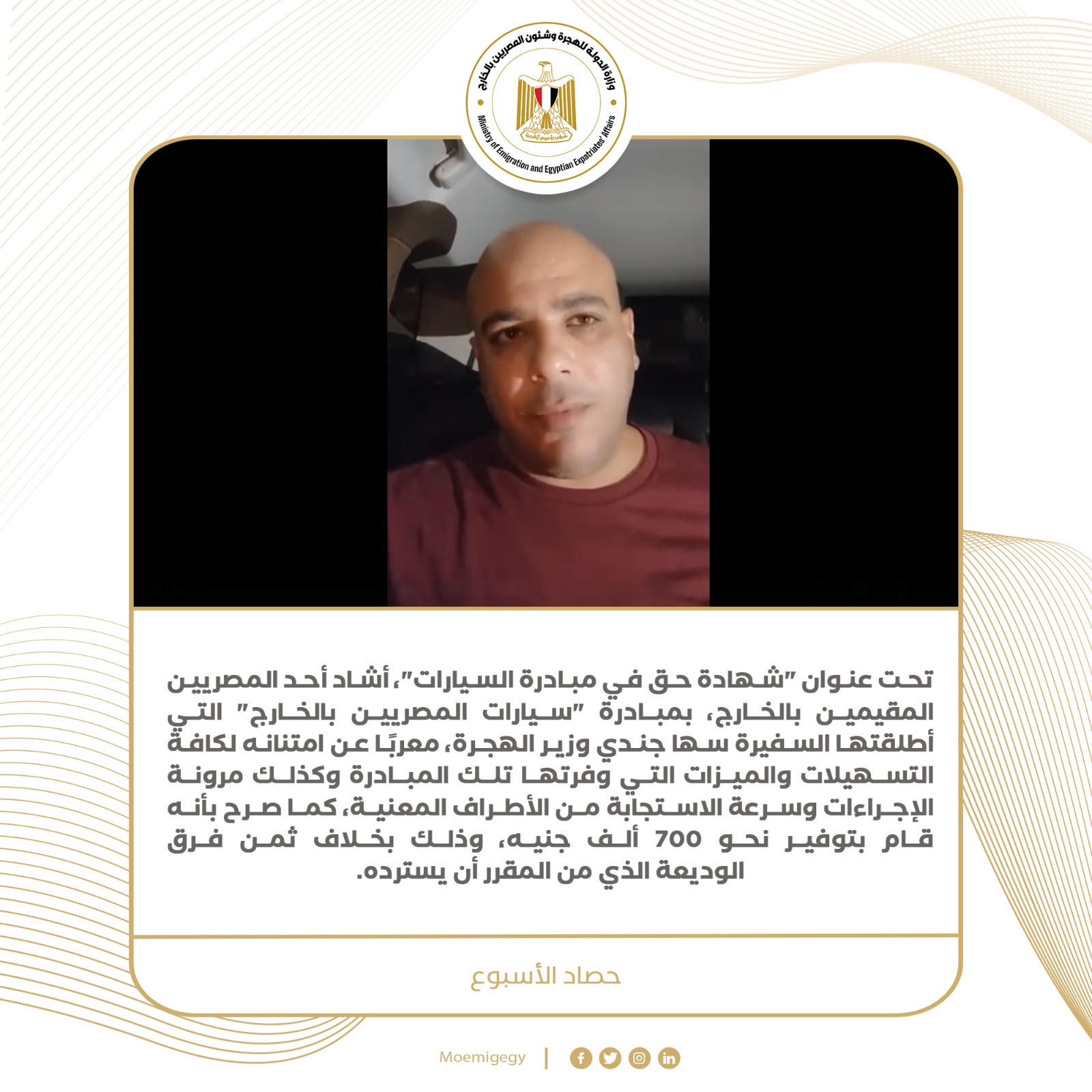 وتحت عنوان "شهادة حق في مبادرة السيارات"، أشاد أحد المصريين المقيمين بالخارج، بمبادرة "سيارات المصريين بالخارج" التي أطلقتها السفيرة سها جندي وزير الهجرة، معربًا عن امتنانه لكافة التسهيلات والميزات التي وفرتها تلك المبادرة وكذلك مرونة الإجراءات وسرعة الاستجابة من الأطراف المعنية، كما صرح بأنه قام بتوفير نحو ٧٠٠ ألف جنيه، وذلك بخلاف ثمن فرق الوديعة الذي من المقرر أن يسترده.